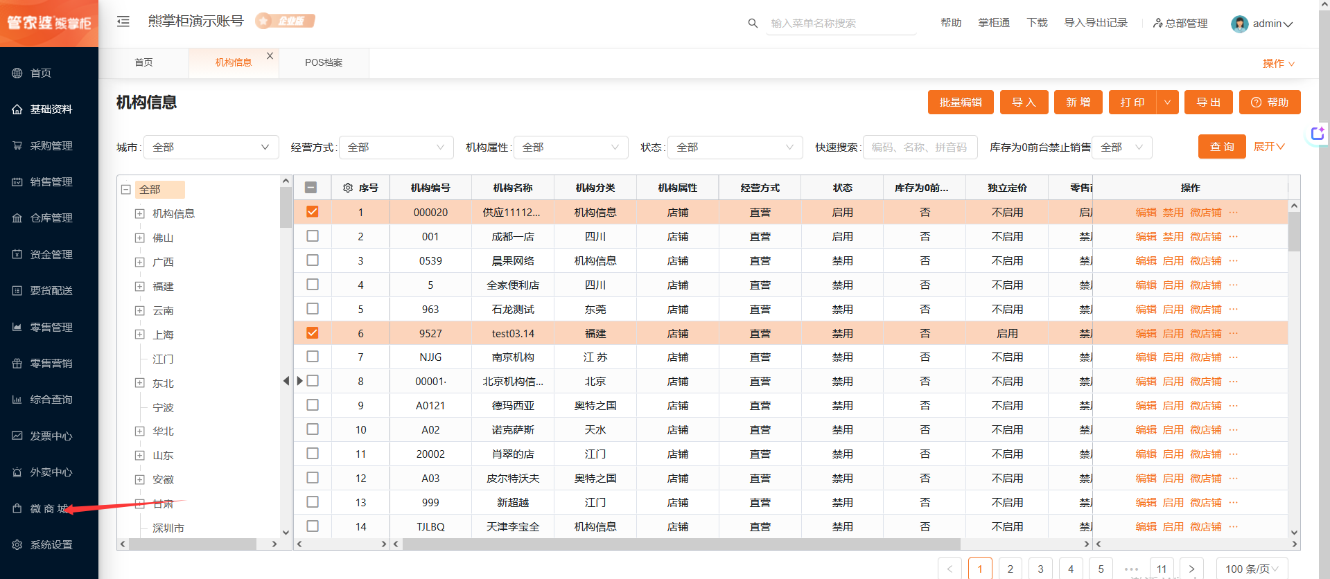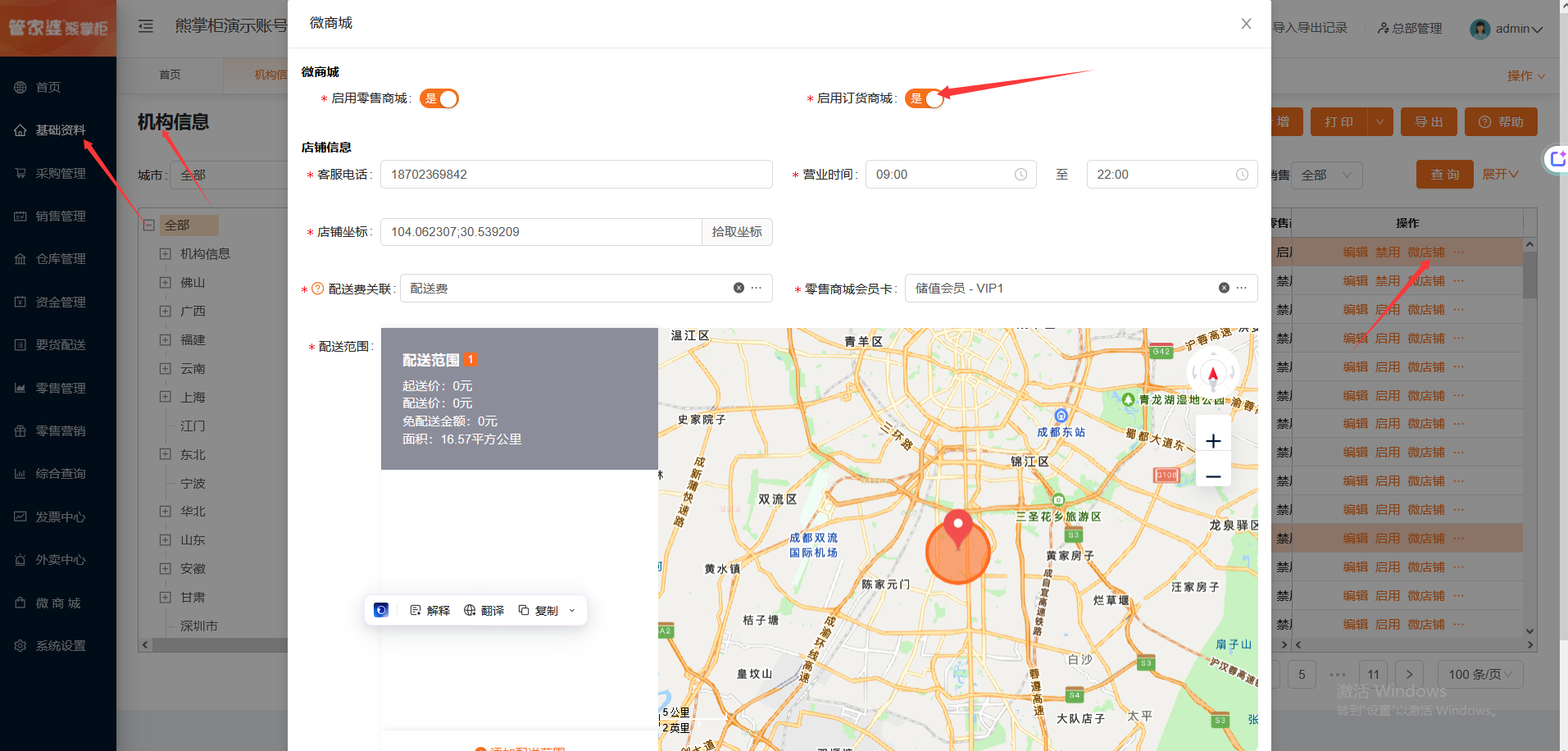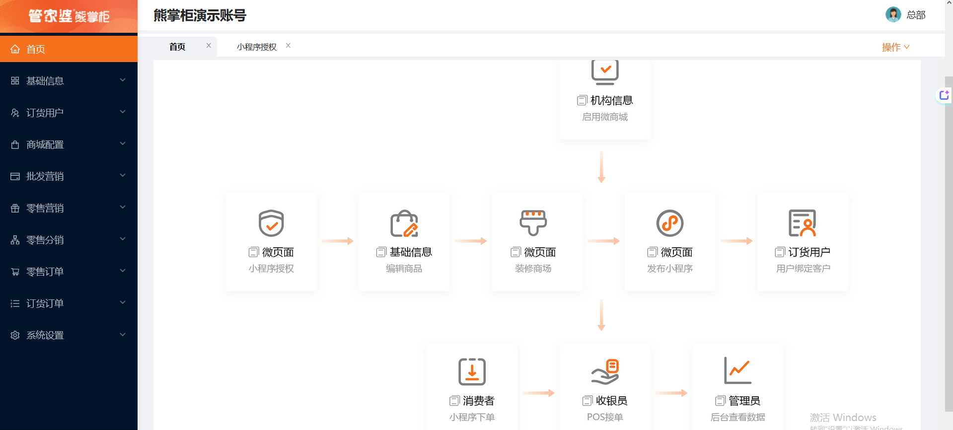 登录熊掌柜后台,基础资料--机构信息--选择机构,点击微商城,启用订货商城,并填写营业时间。