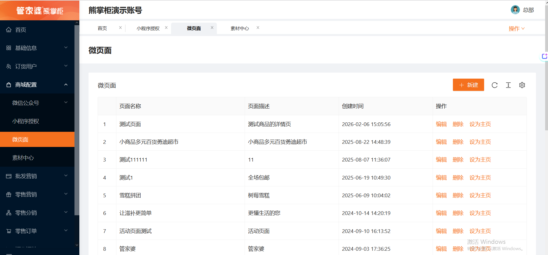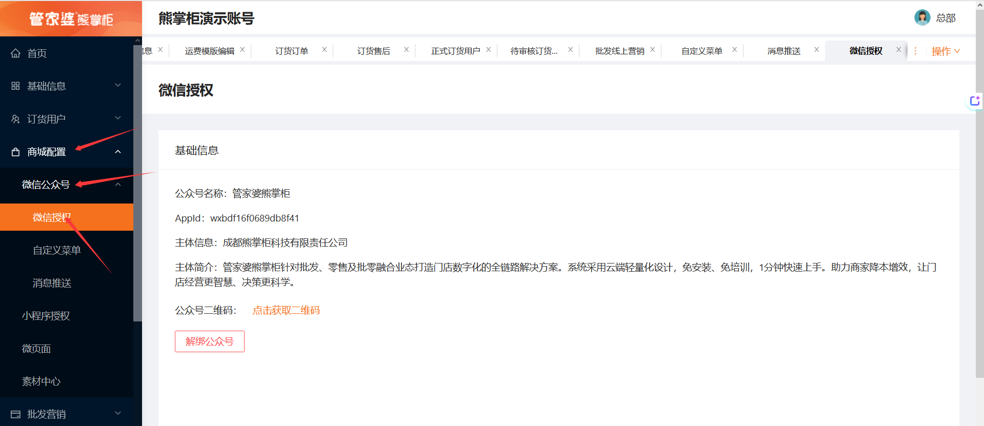 登录熊掌柜后台后,点击左边导航栏的微商城,会进入微商城的后台;