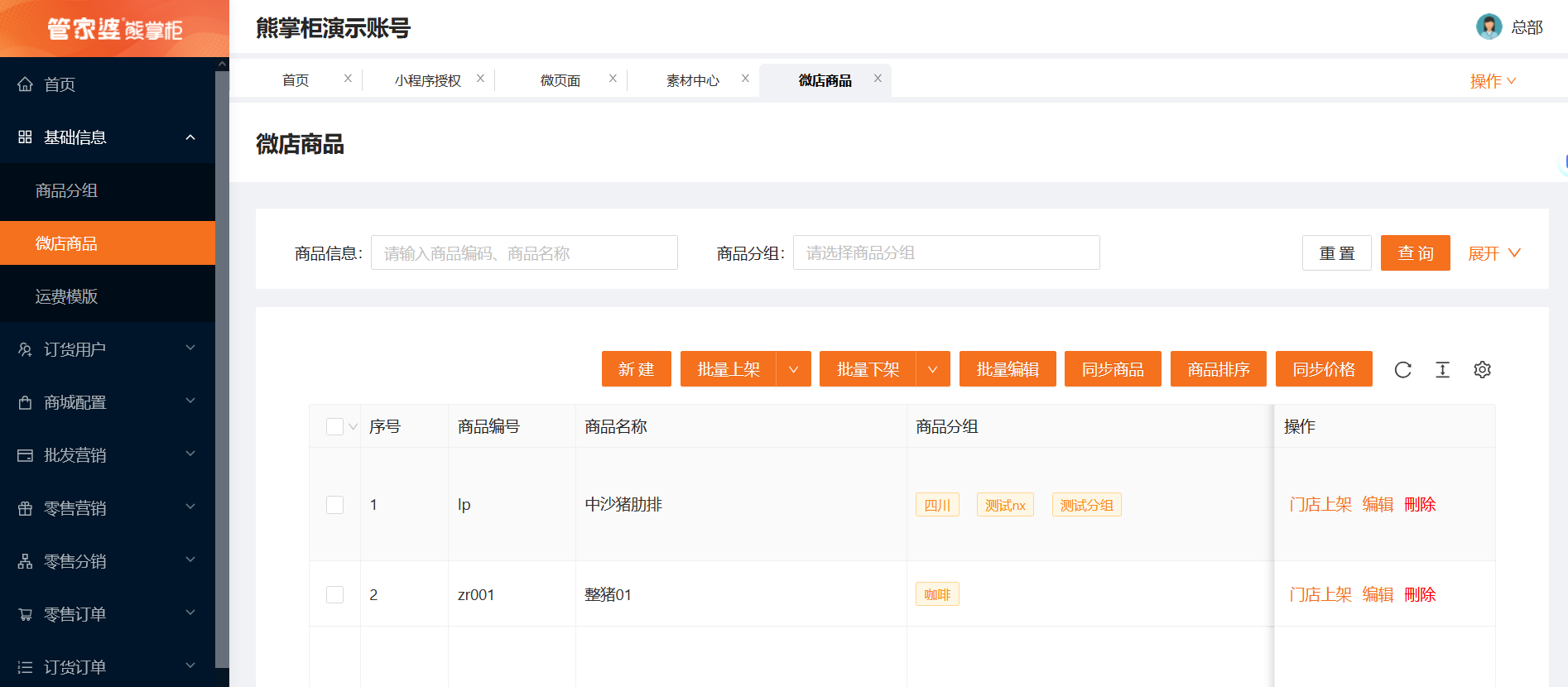 微商城后台,基础信息--微店商品--新增商品(商品的上/下架也在这里操作),基础信息--商品分组,可以创建商品分组名称(分组下有商品的是不允许删除商品分组的),创建商品的界面需要关联熊掌柜库存商品,使小程序订单出库后,后台系统对应商品库存减少(也可以直接点击右上角的同步商品,直接同步熊掌柜的商品到微商城);