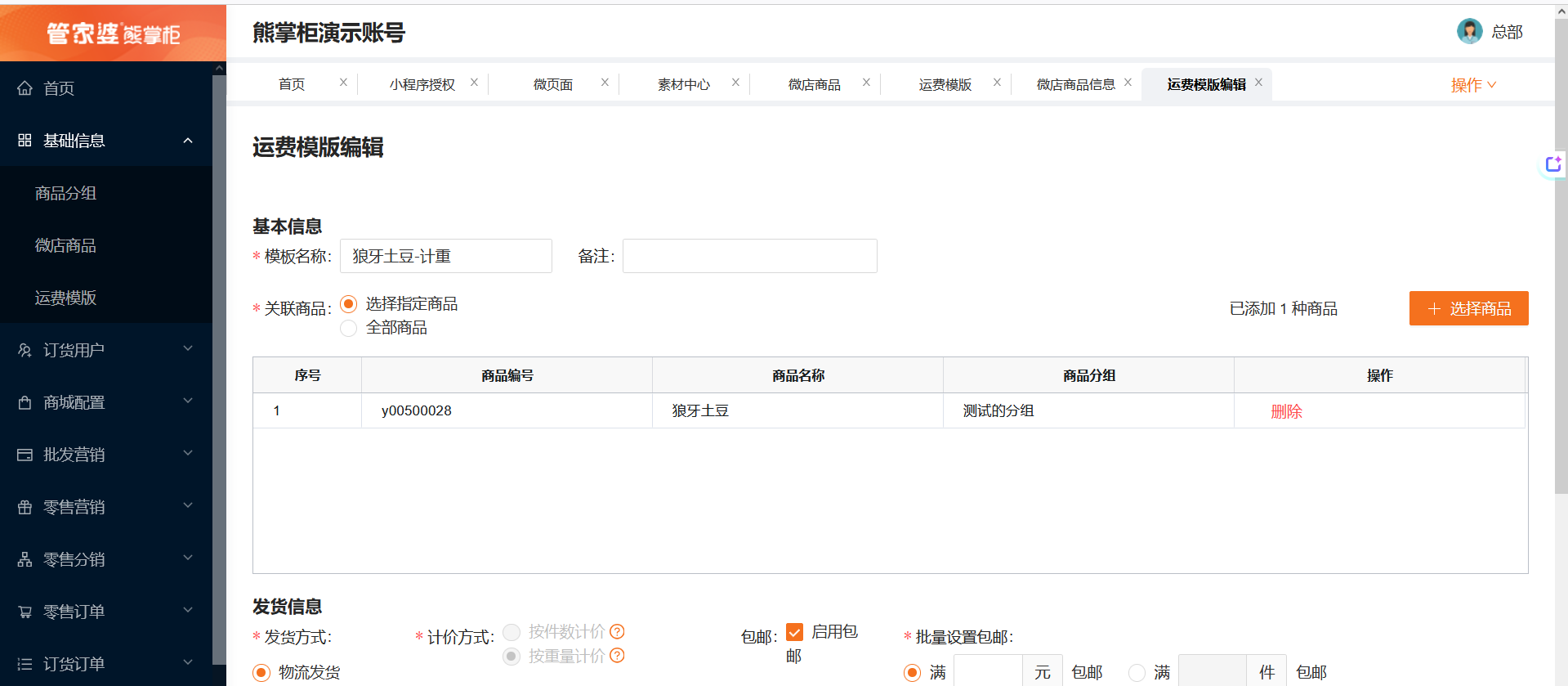 基本信息--关联商品:设置可以通过快递物流发货的商品