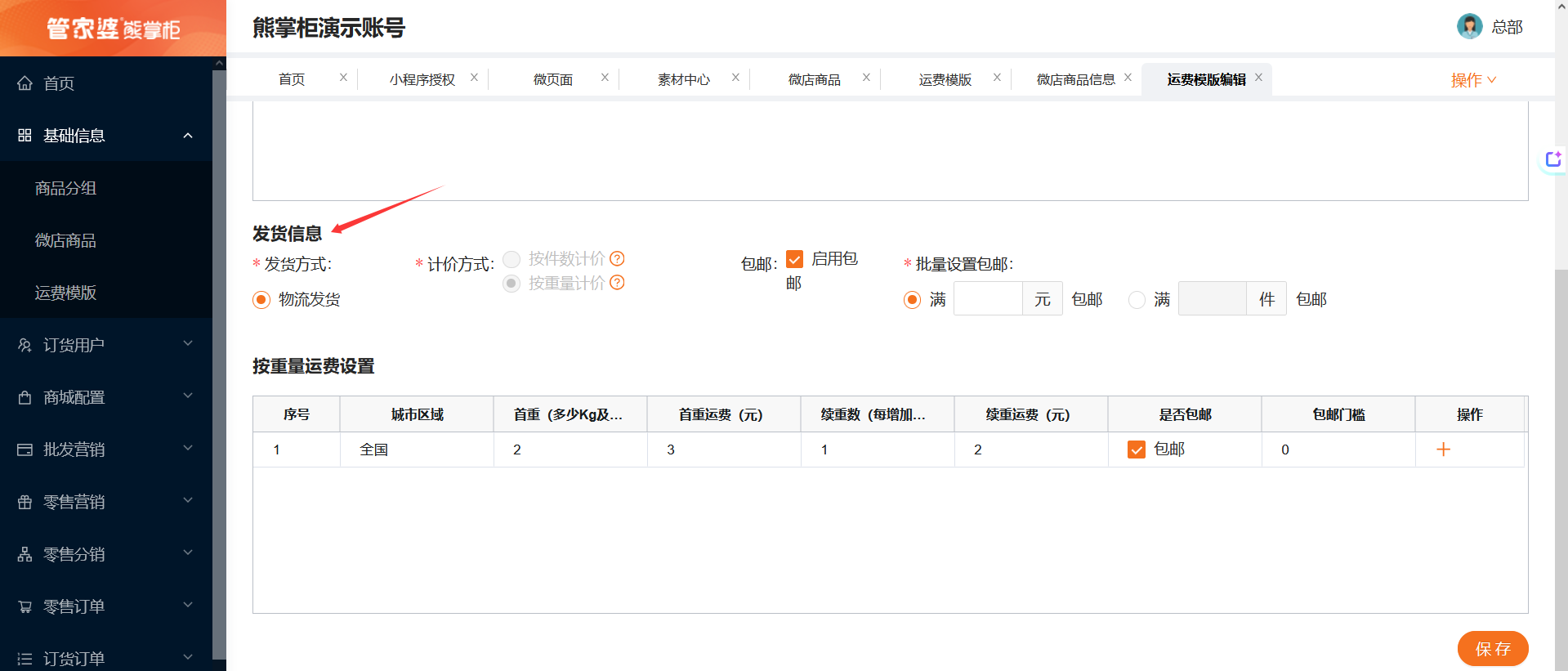1、设置运费模板:微商城后台--基础信息--运费模板