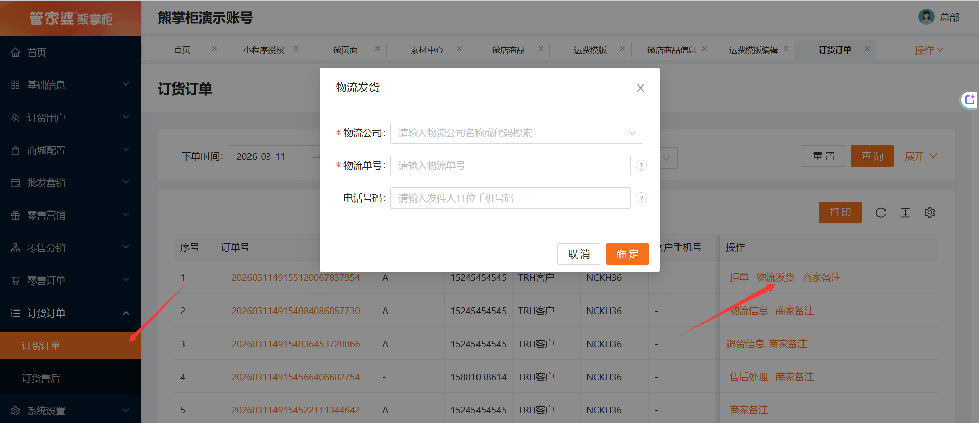 微商城后台--订货订单,找到单子后,点击物流发货,录入物流公司和物流单号后,用户就可以在小程序--订单里查看物流详情。