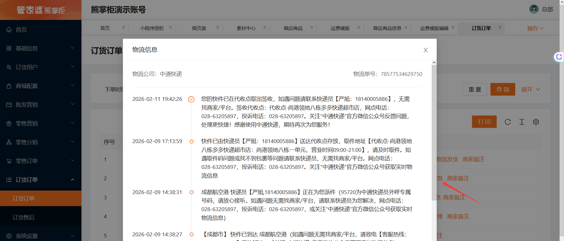 已录入物流信息的单据,点击查看物流信息,商家也可以查看详情。