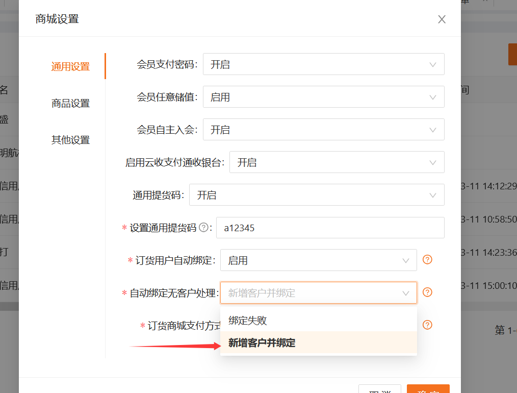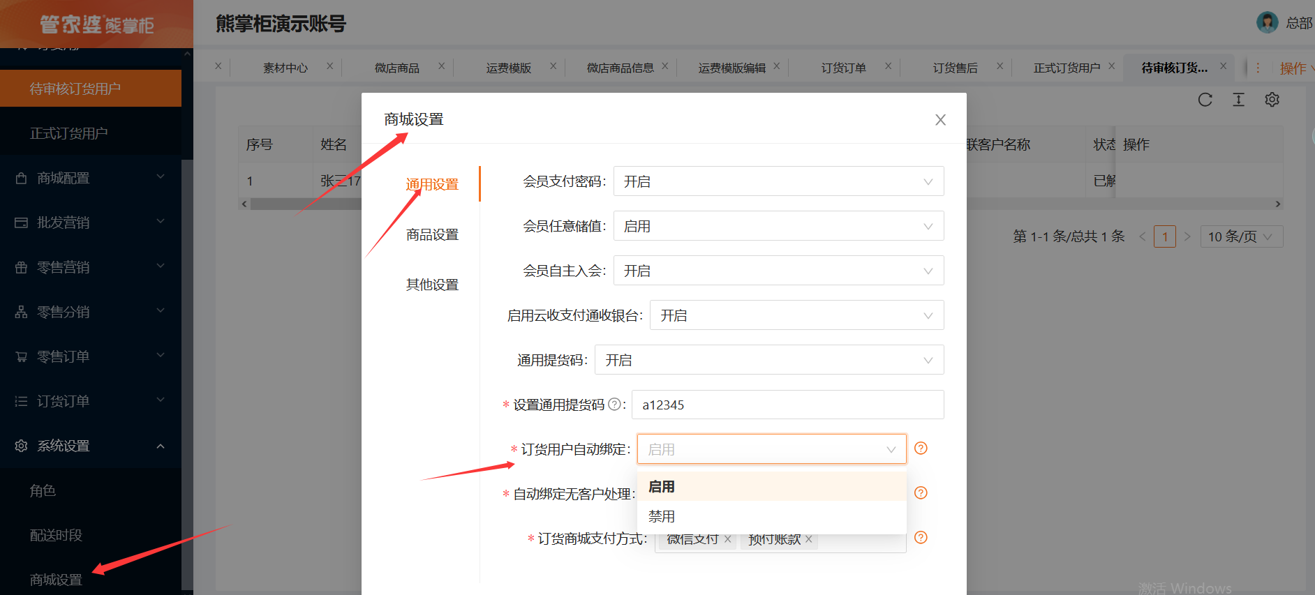 1、用户设置:微商城后台--商城设置--通用设置--订货用户自动绑定,建议选择启用(选择启用后,小程序上注册用户后,自动和后台已有的 客户信息自动绑定上,该订货用户自动显示在正式订货用户列表里;选择禁用后,订货用户在小程序里--我的--申请订货里申请后,商家需要到微商城后台--订货用户--待审核订货用户里点击审核,并关联已有的客户后,才会显示在正式订货用户列表里)