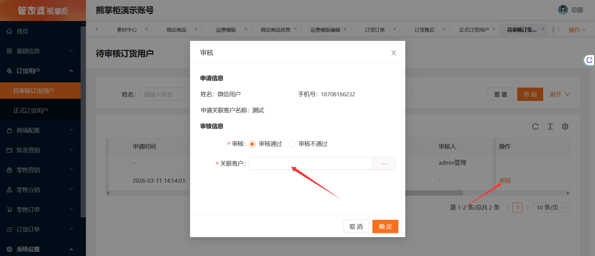 启用自动绑定后,自动绑定无客户处理:如果选择绑定失败,当该订货用户申请后,后台没有这个手机号码的客户时,该订货用户的申请就会到待审核订货用户里,商家手动审核并绑定客户;如果选择新增客户并绑定,当该订货用户申请后,后台没有这个手机号码的客户时,后台会自动新增这个客户信息,该用户自动到正式订货用户里。