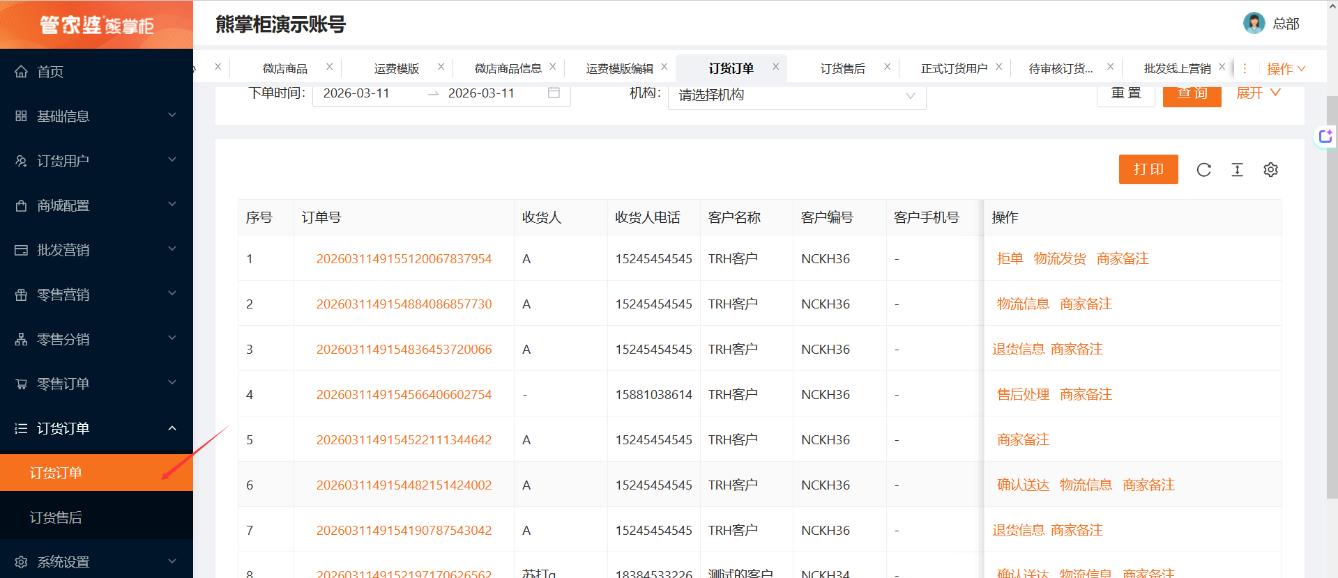 1、微商城后台--订货订单--订货订单里查询(熊掌柜后台--零售管理--接单配置里绑定了接单pos ,也可在pos--接单里查看订单)