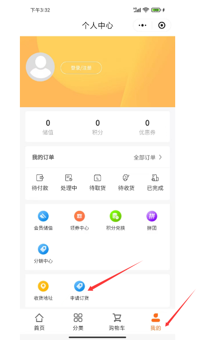 2、订货用户在小程序里的申请操作:进入小程序--我的--申请订货