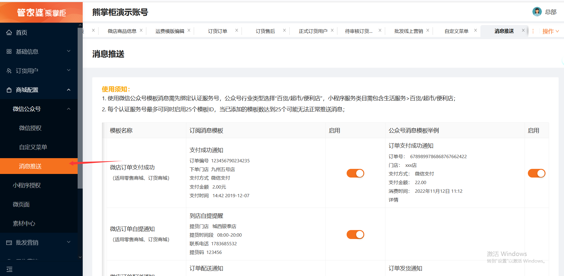 2、开启消息推送:微商城后台--商城设置--微信公众号--消息推送里开启