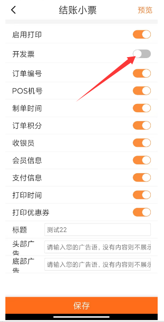 2. 第二步:打印模版设置,在【结账小票】模版销售票尾中加入开票二维码。