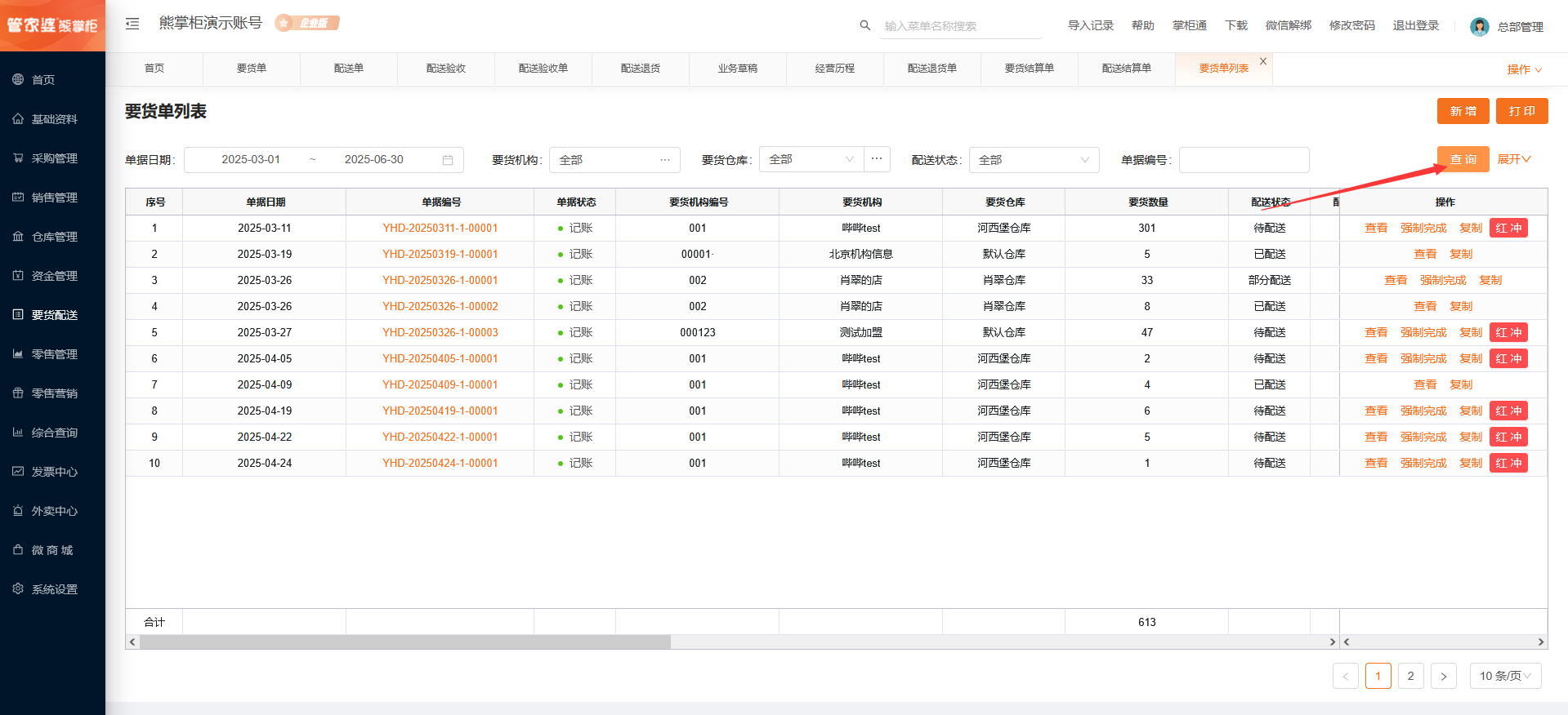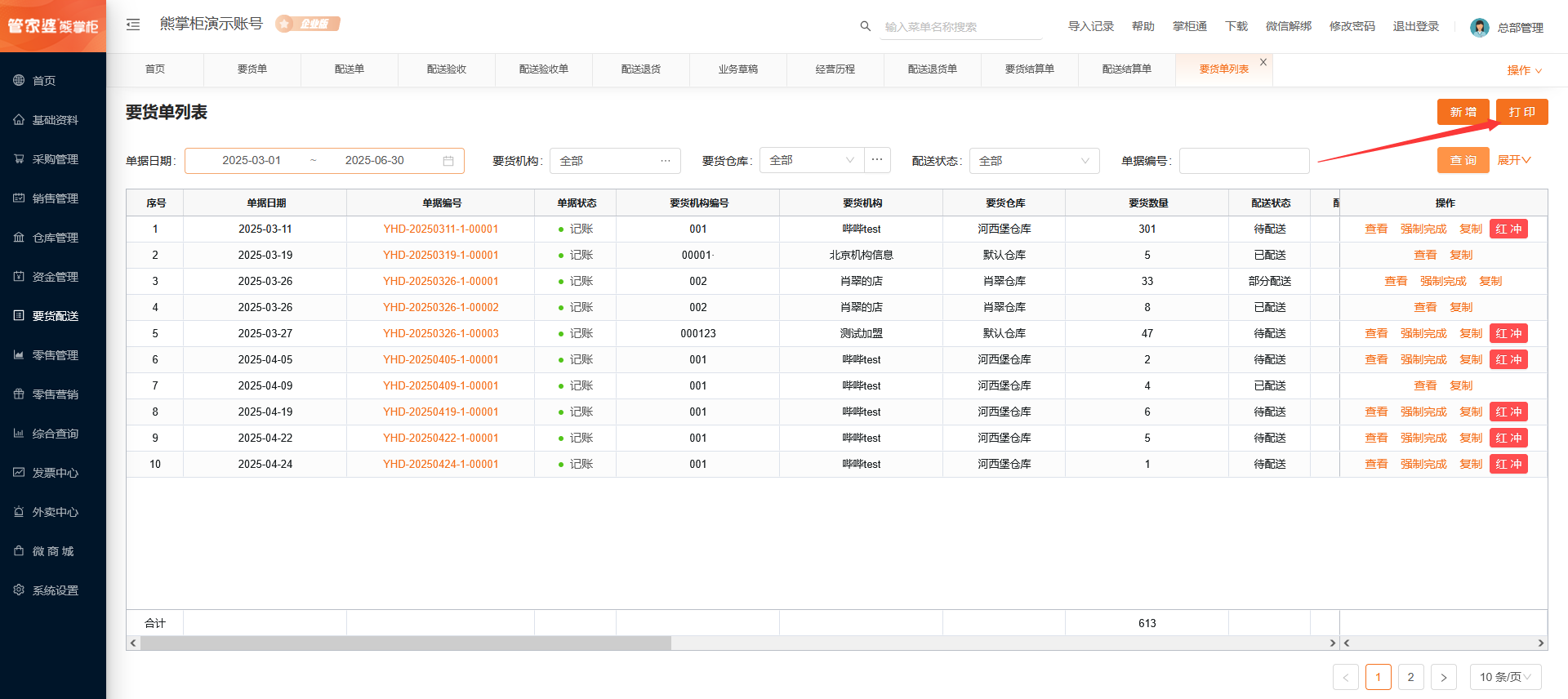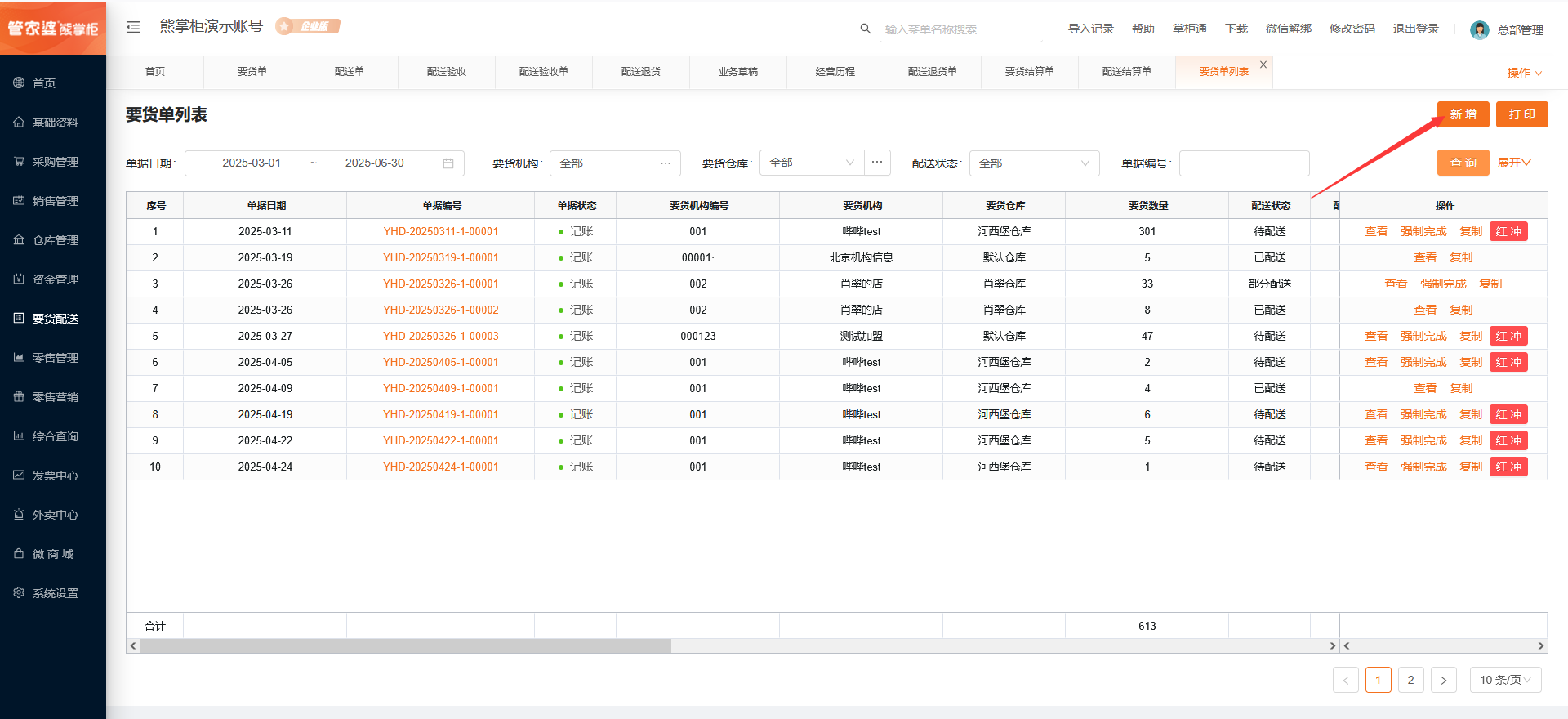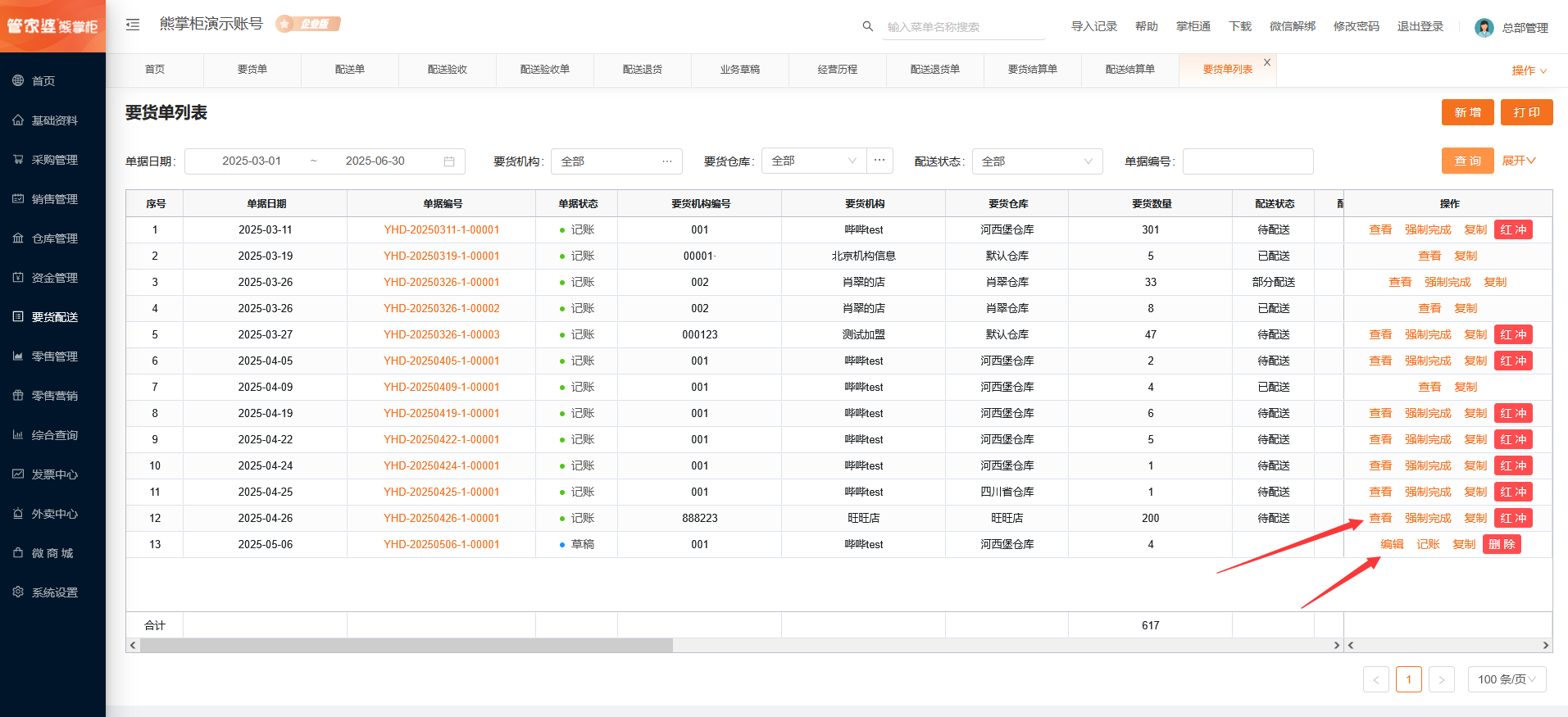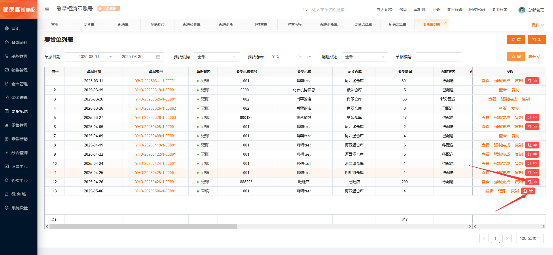 点击强制完成后,单据状态变为已配送状态,配送数量为0.