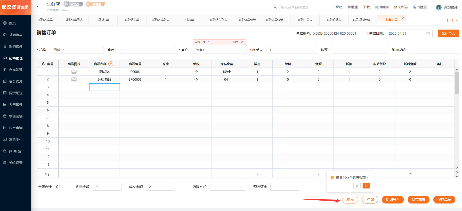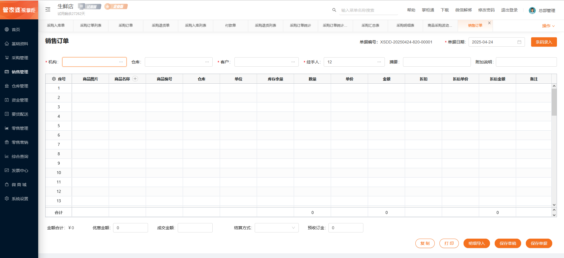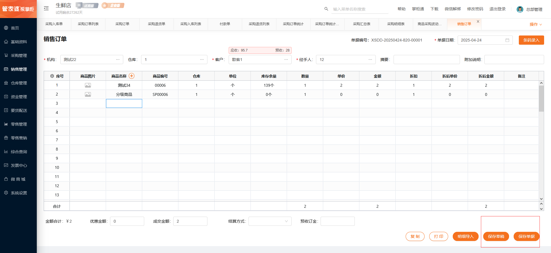 若在总部视角创建单据,则需要选择对应的销售机构、仓库和客户;若在门店视角创建单据,则机构默认为当前门店不可选择,需要选择对应的仓库和客户。