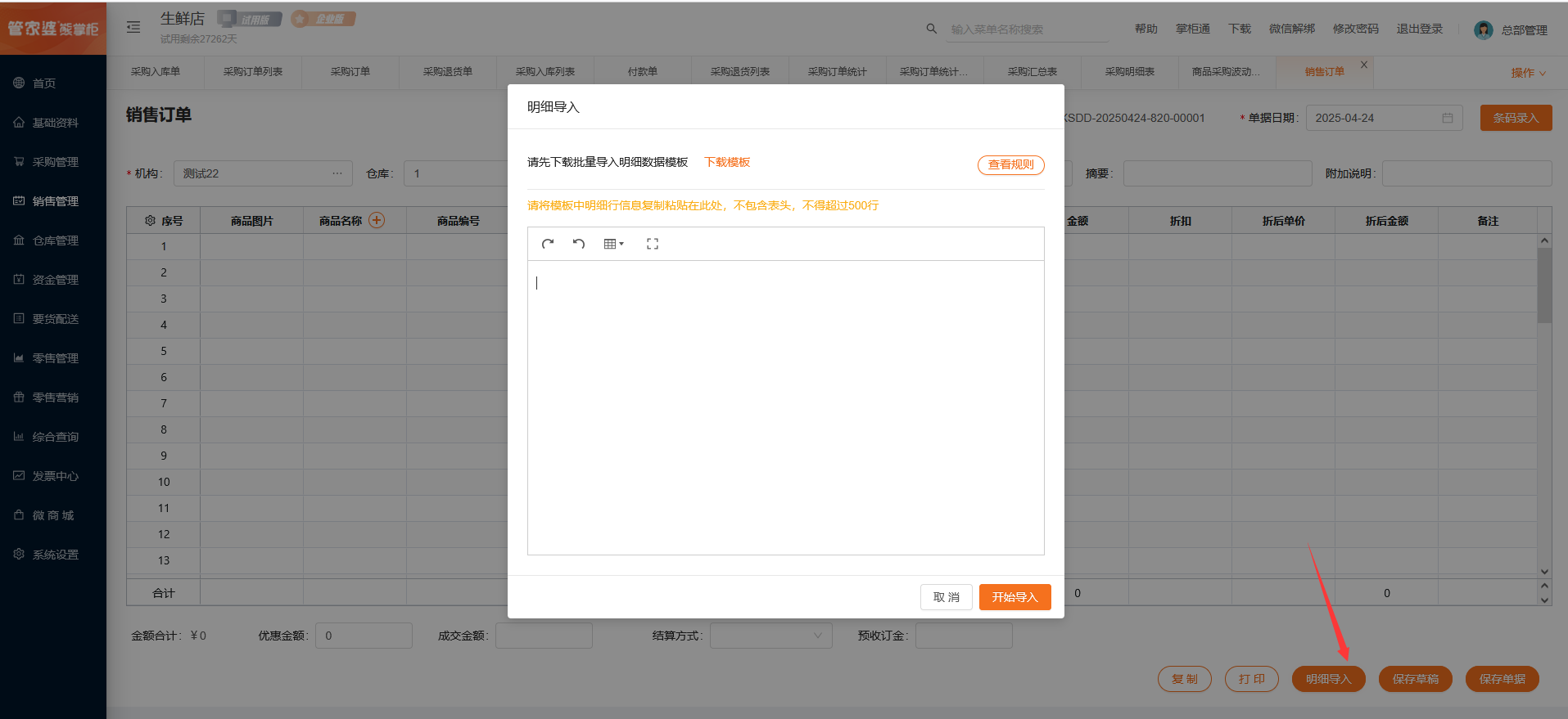 若单据商品明细过多时可选择明细导入功能,点击【明细导入】按钮后下载模板,将数据填入模板后复制数据并粘贴在单据内的明细导入框中即可导入明细。