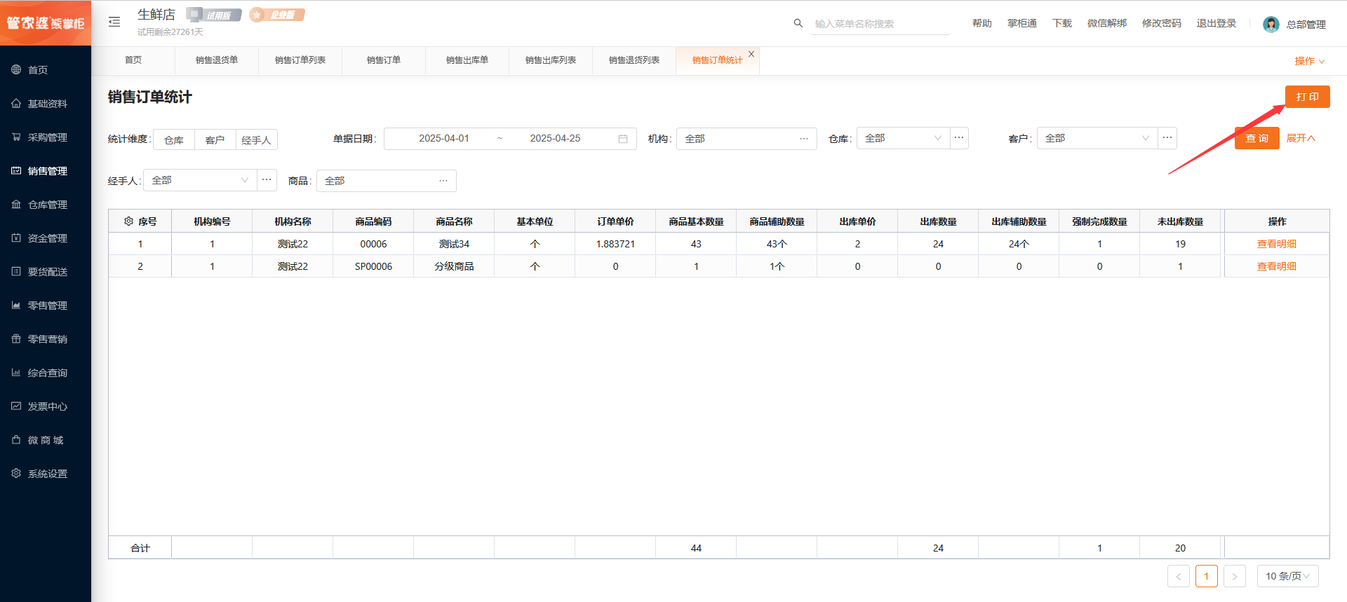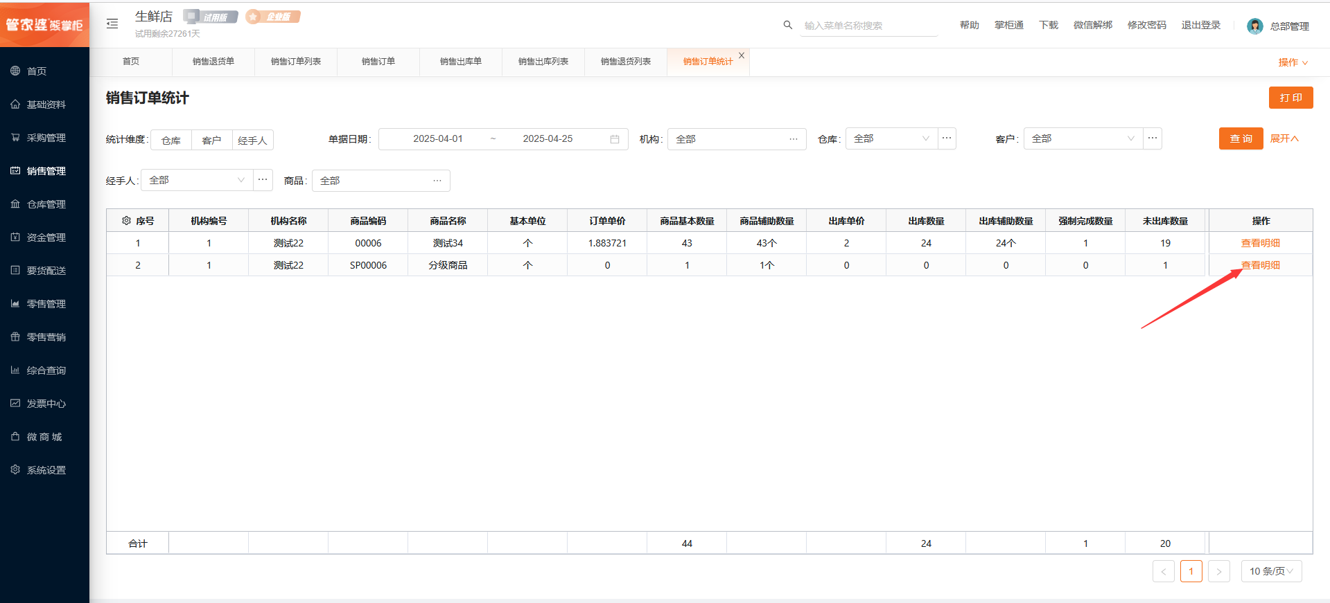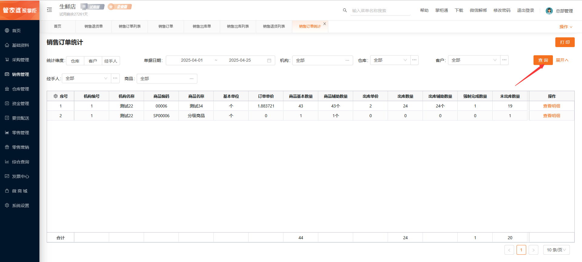 销售订单统计表根据统计维度仓库、客户、经手人查询,可根据机构、商品筛选查询