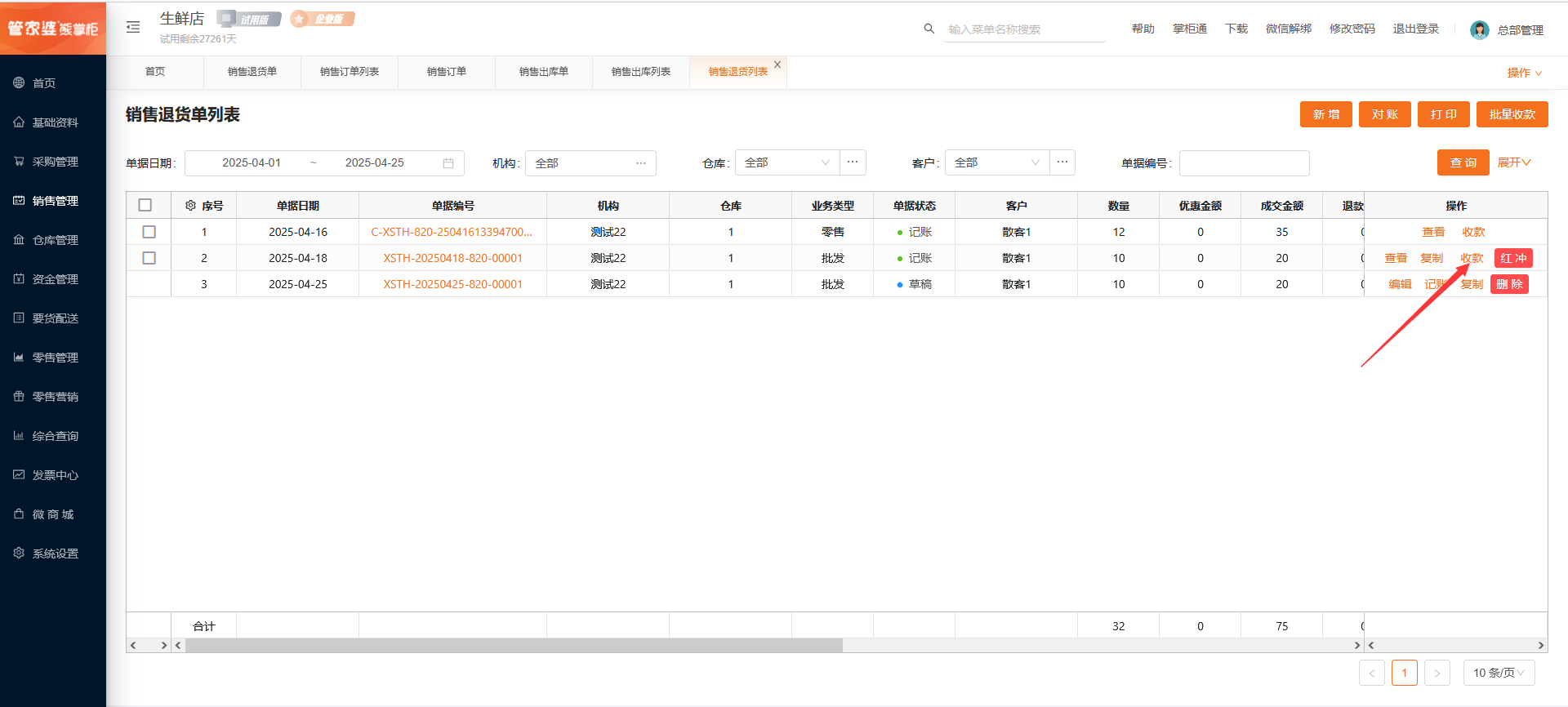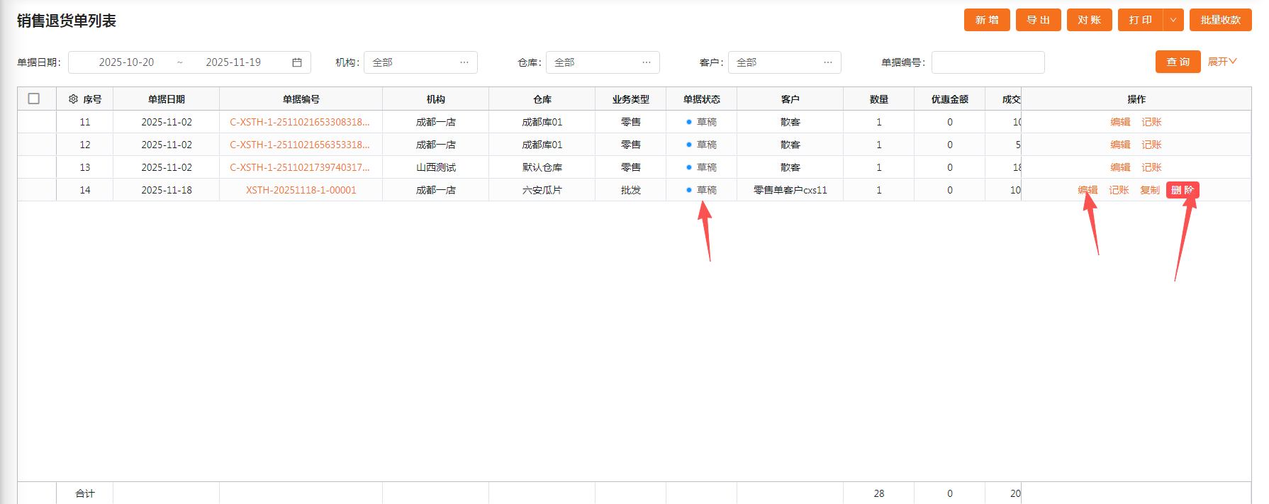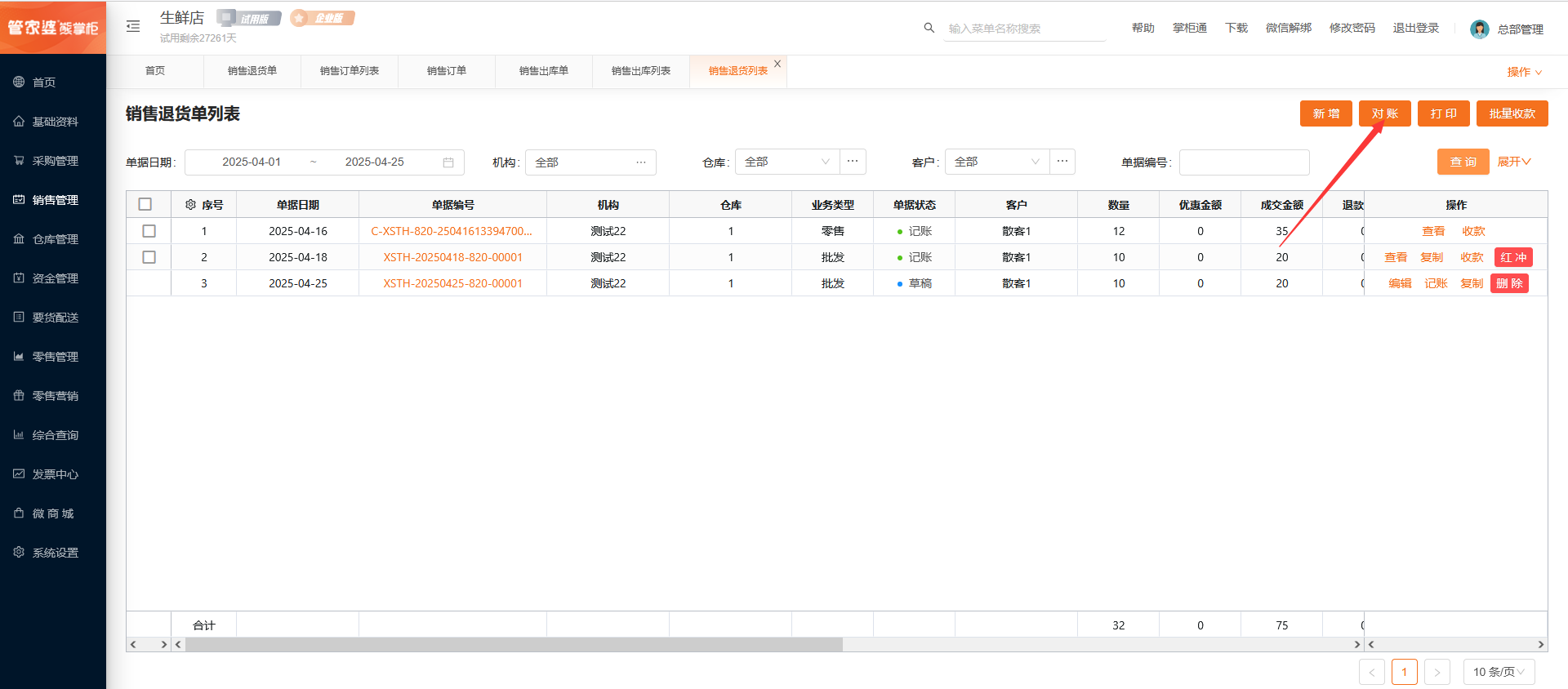 选择单据点击对账后,单据变成已对账状态,在做收款单时,不支持调取已对账的销售退货单。