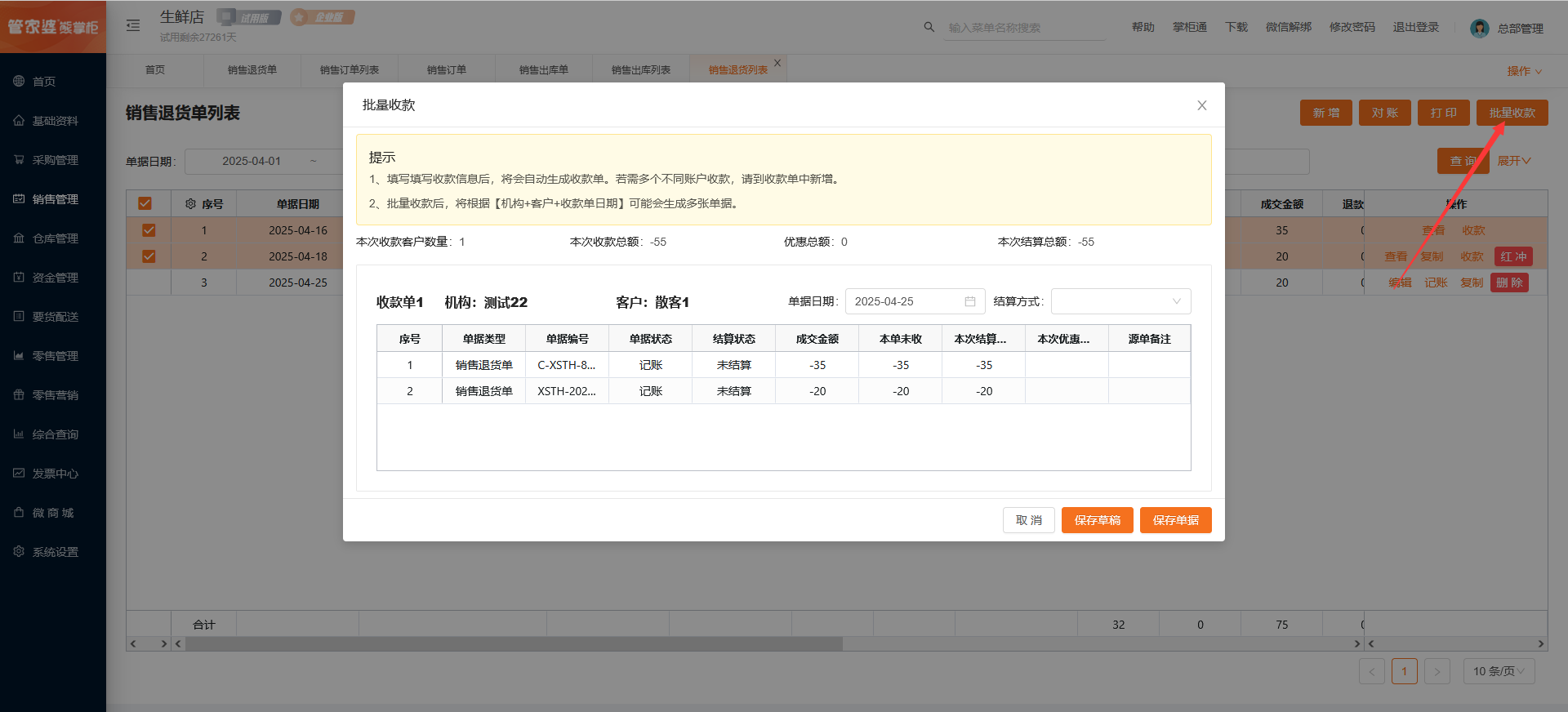 选择单据,点击批量收款,将根据【机构+客户+收款单日期】可能会生成多张收款单。