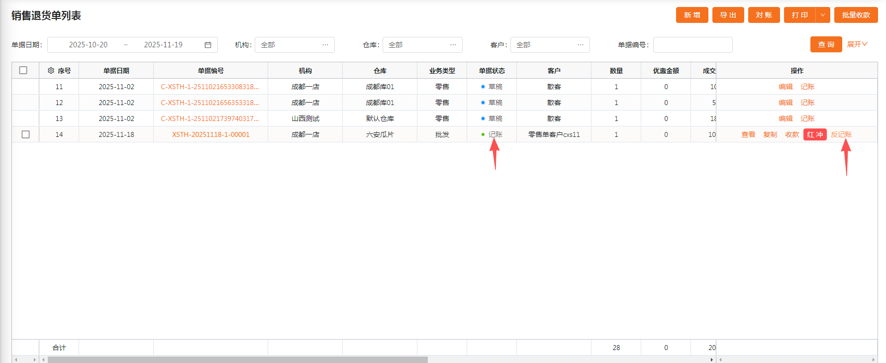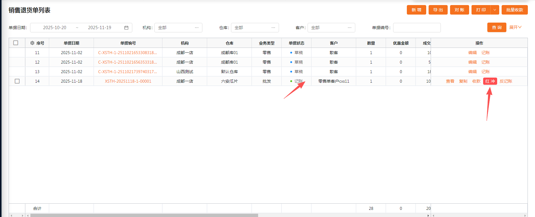 已记账但不需要也不想执行删除操作的销售退货单可以选择红冲
