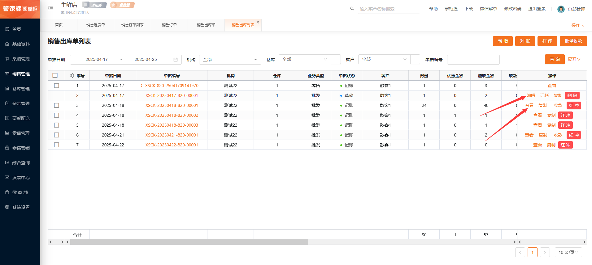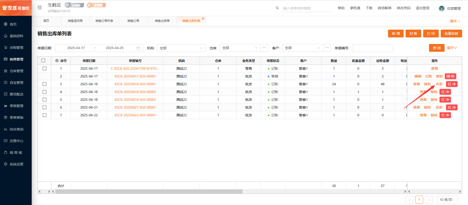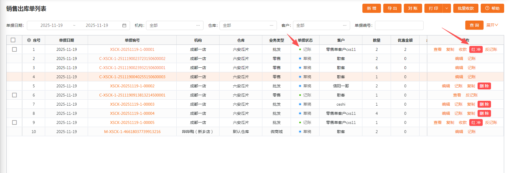 选择单据,点击批量收款,将根据【机构+客户+收款单日期】可能会生成多张收款单。