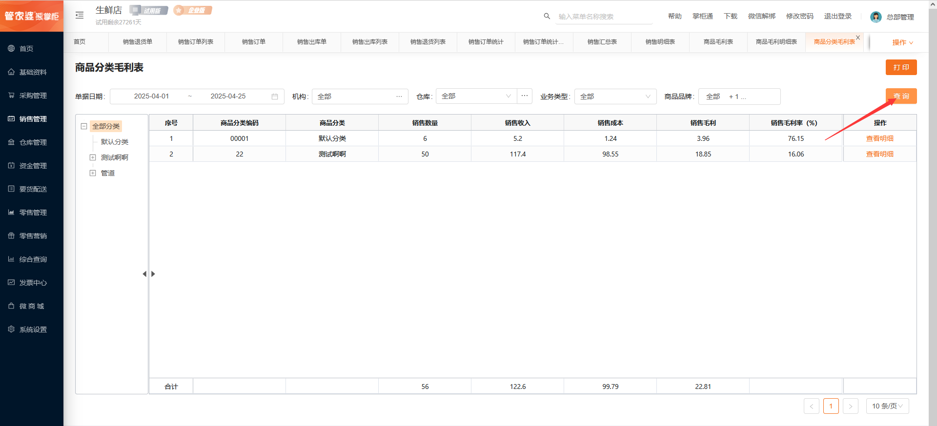 点击查看明细,可以查看具体的商品销售毛利情况。