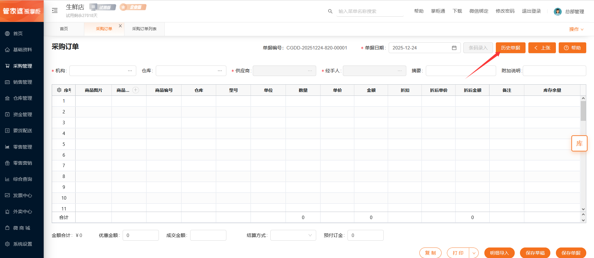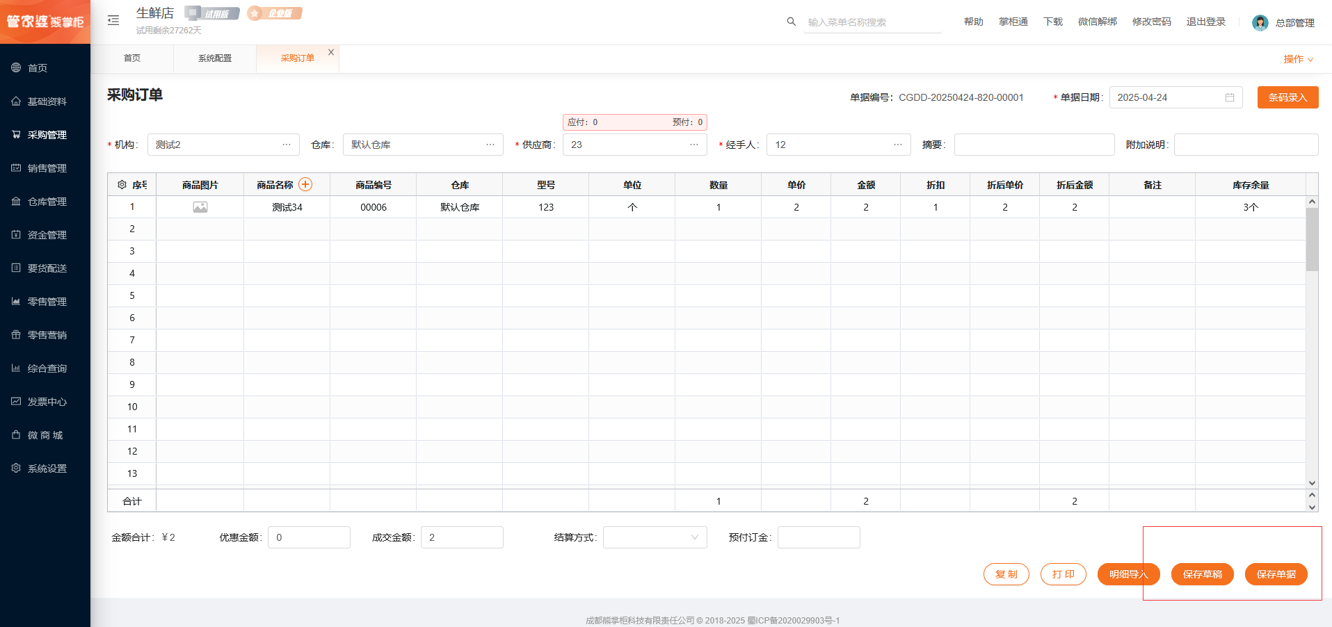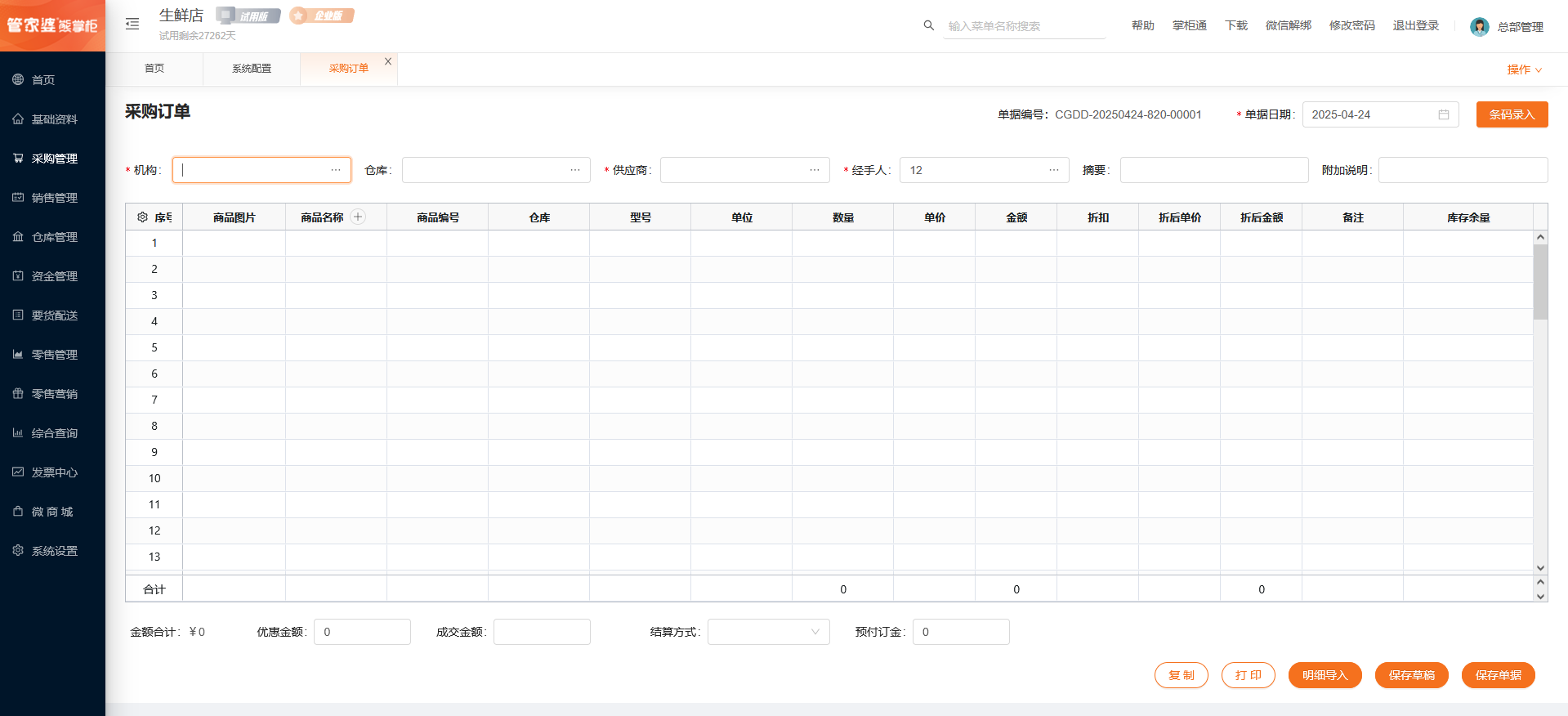 若在总部视角创建单据,则需要选择对应的采购机构、仓库和供应商;若在门店视角创建单据,则机构默认为当前门店不可选择,需要选择对应的仓库和供应商。