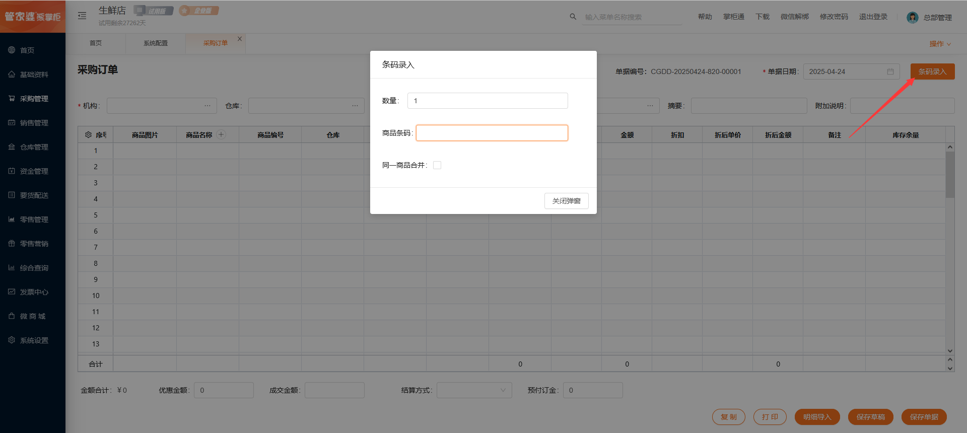 注:所有商品相关单据都有条码录入按钮,可使用条码枪扫描商品条码直接录入商品,支持多次扫描同个条码合并或统计好数量扫描条码直接录入商品和数量。