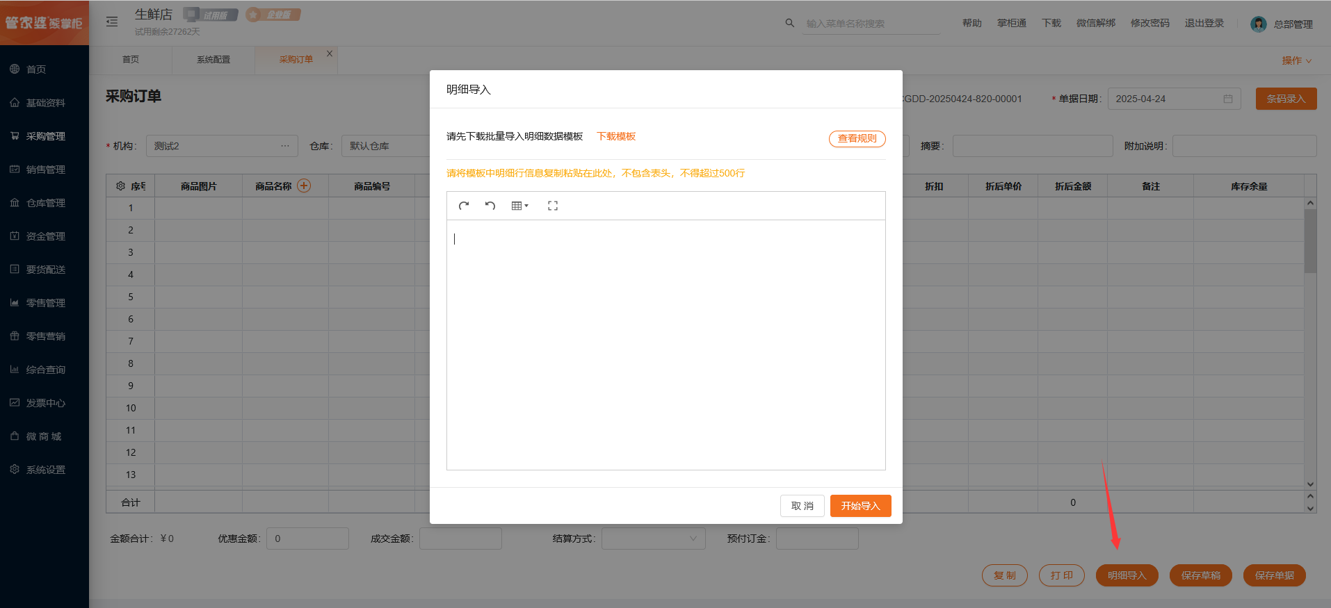 若单据商品明细过多时可选择明细导入功能,点击【明细导入】按钮后下载模板,将数据填入模板后复制数据并粘贴在单据内的明细导入框中即可导入明细。