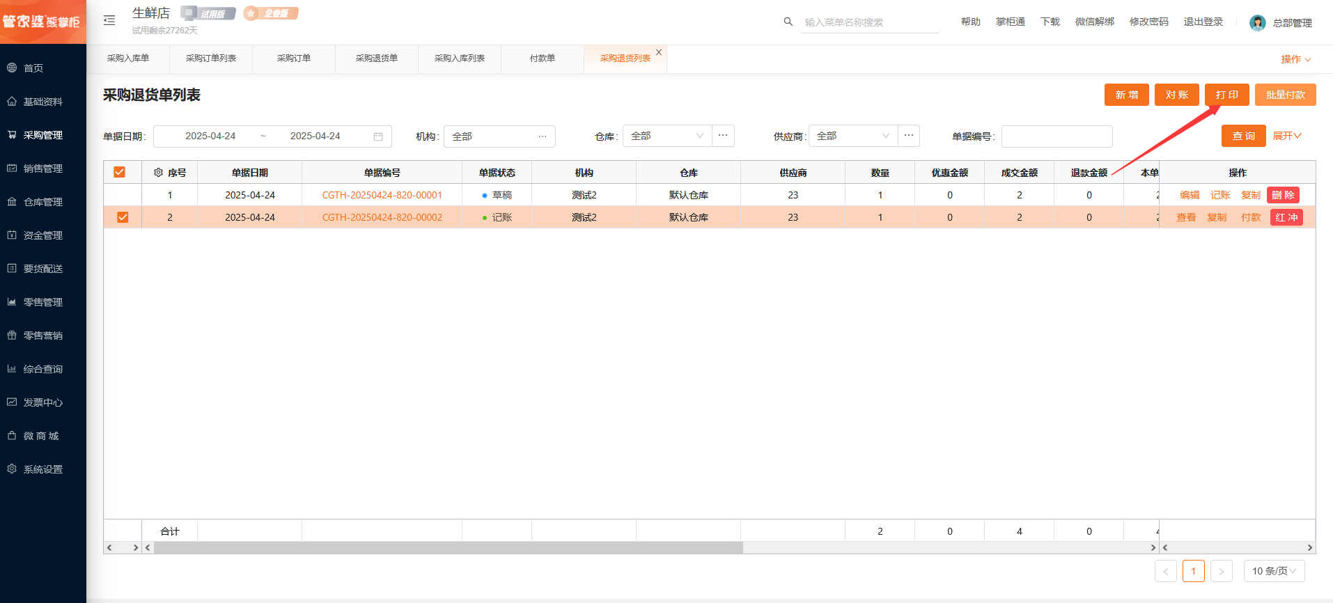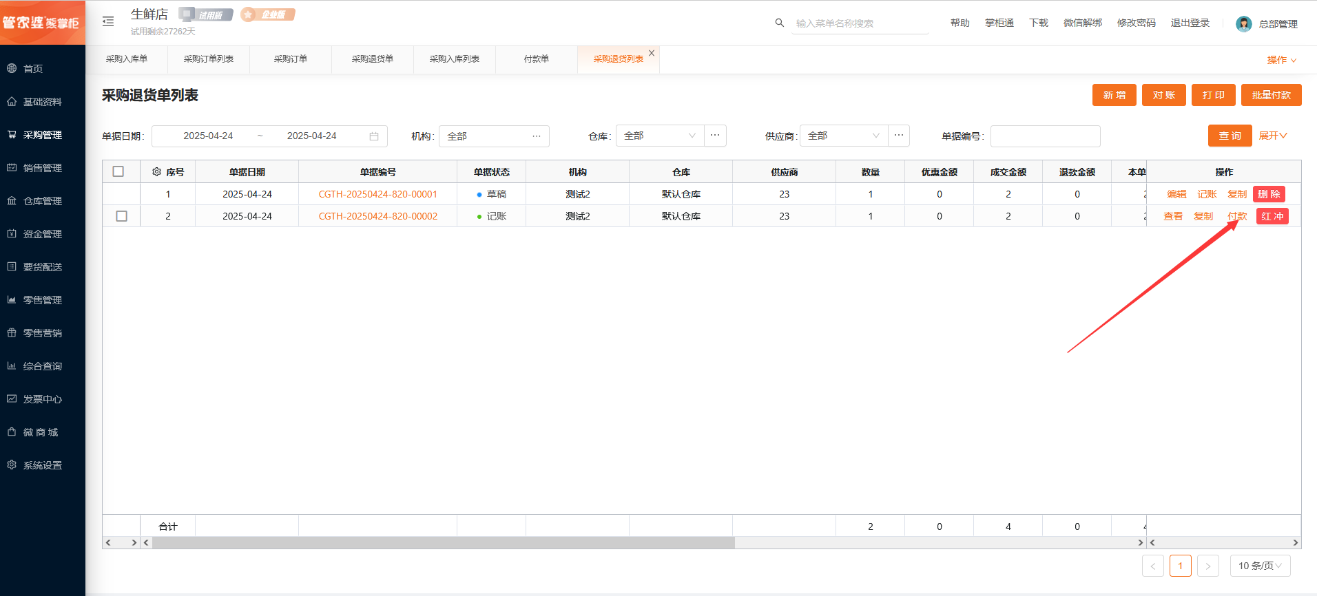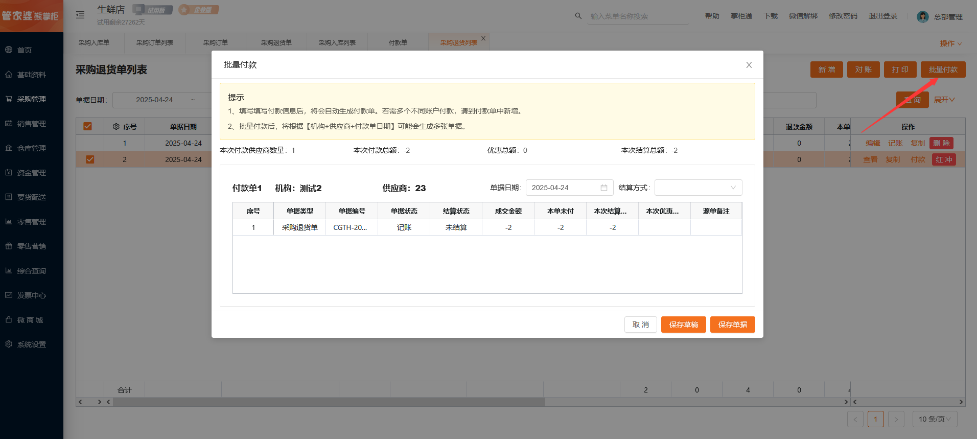 选择单据,点击批量付款,将根据【机构+供应商+付款单日期】可能会生成多张付款单。