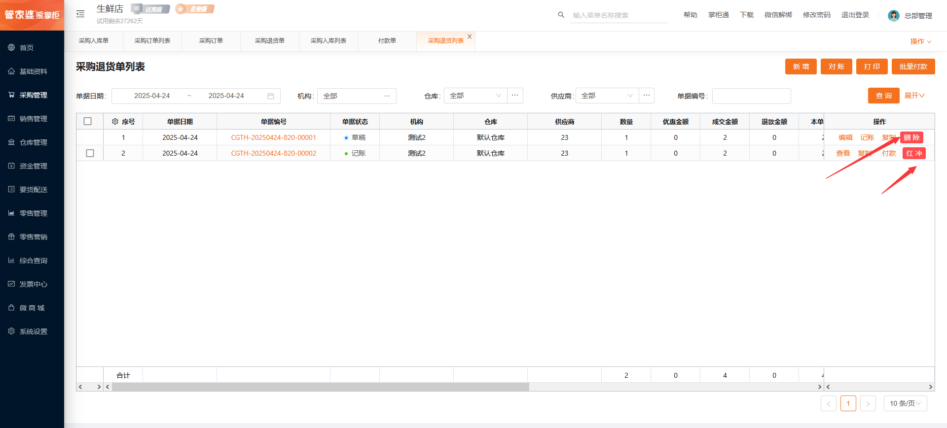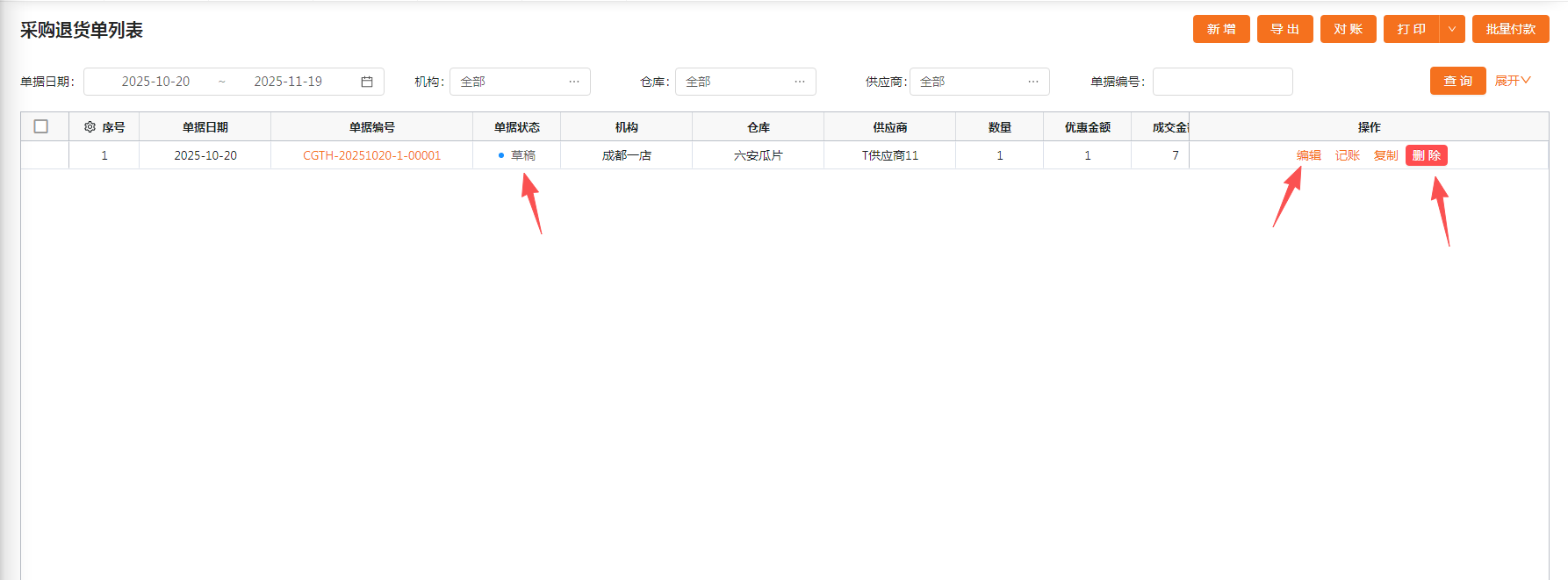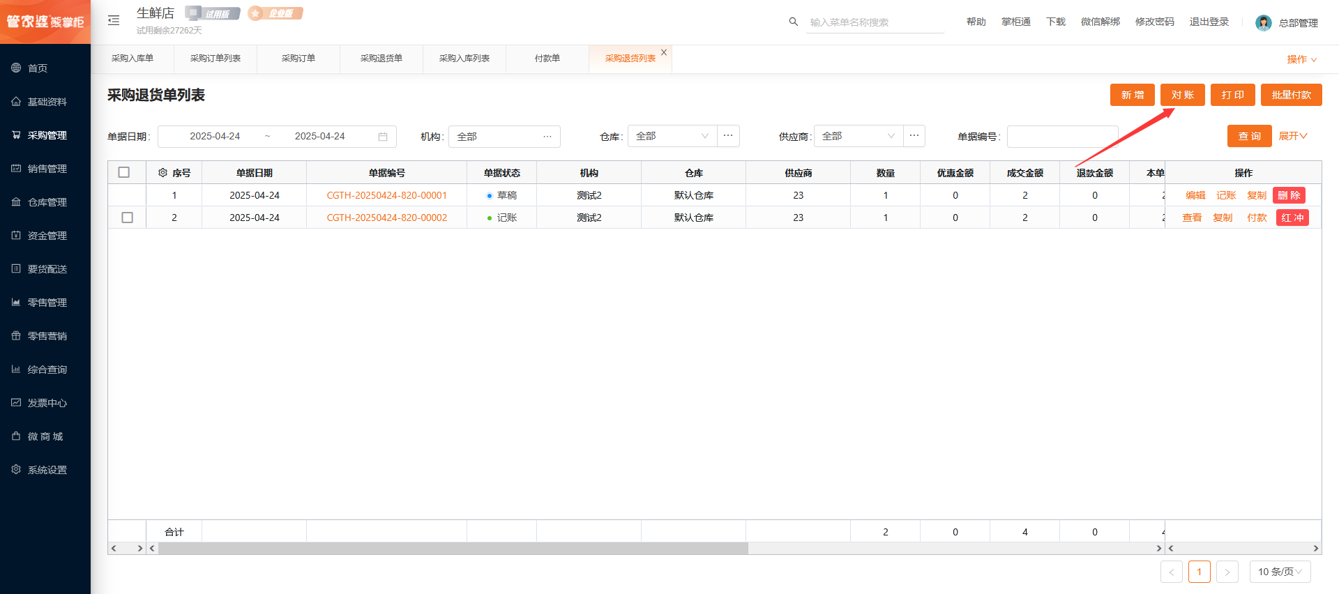 选择单据点击对账后,单据变成已对账状态,在做付款单时,不支持调取已对账的采购退货单。
