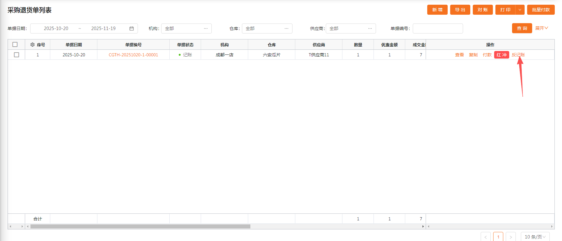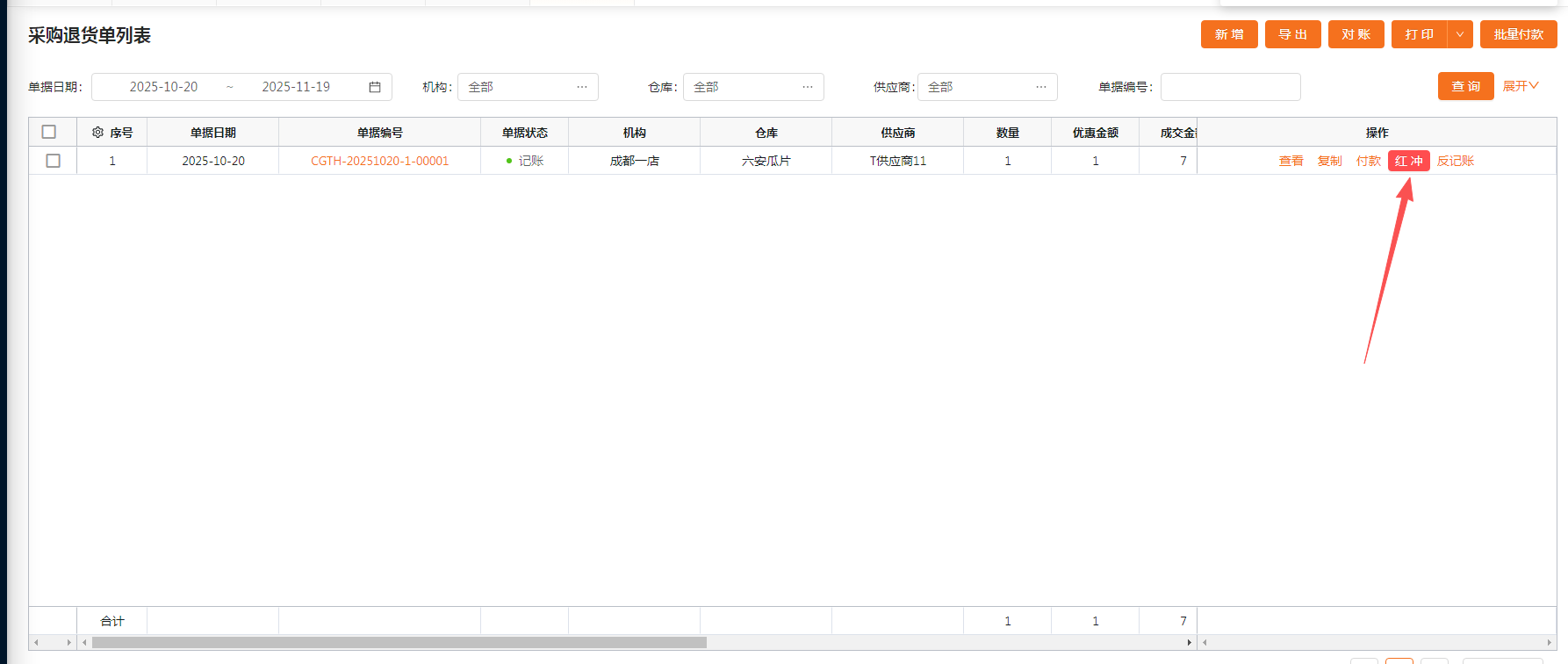 已记账但不需要也不想执行删除操作的采购退货单可以选择红冲