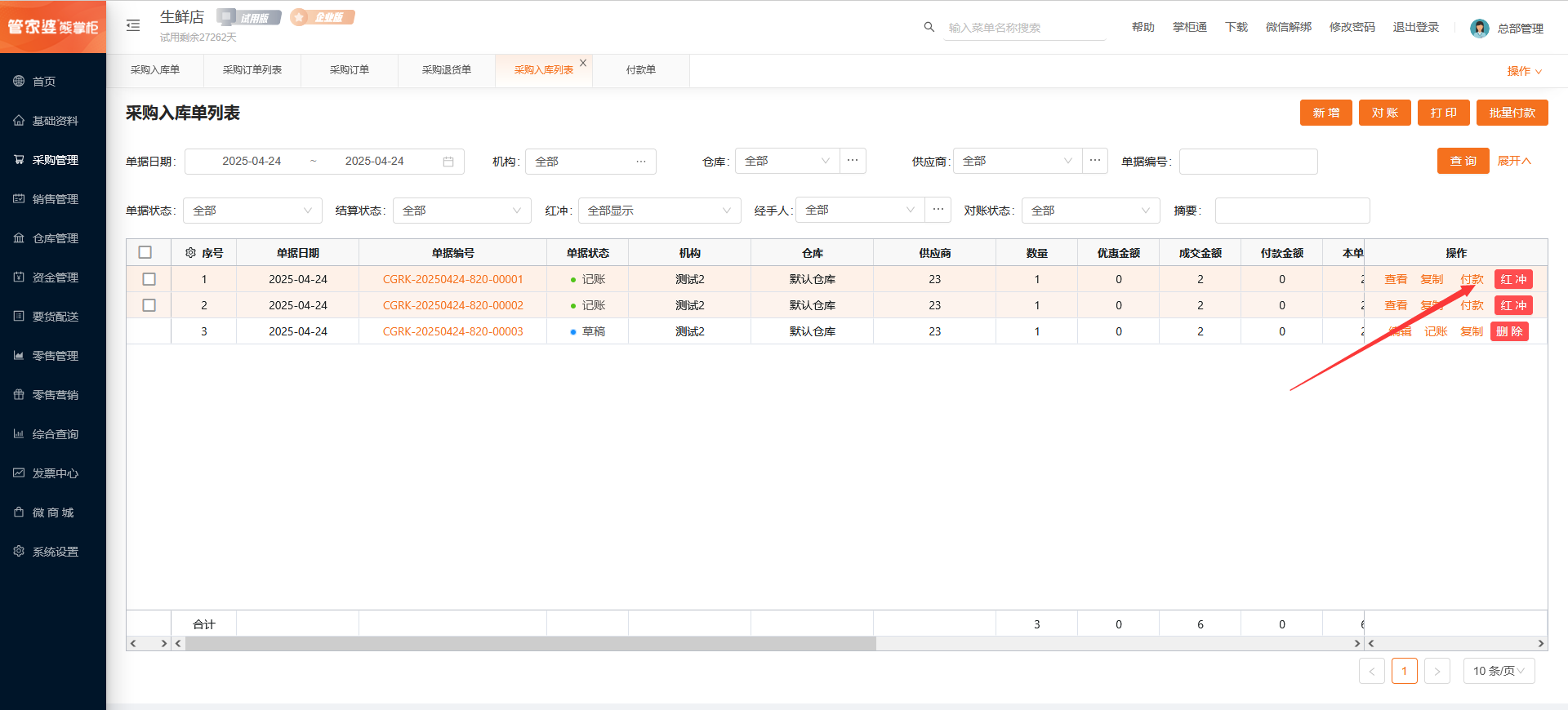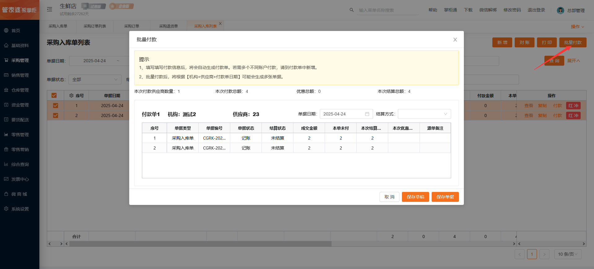 选择单据,点击批量付款,将根据【机构+供应商+付款单日期】可能会生成多张付款单。