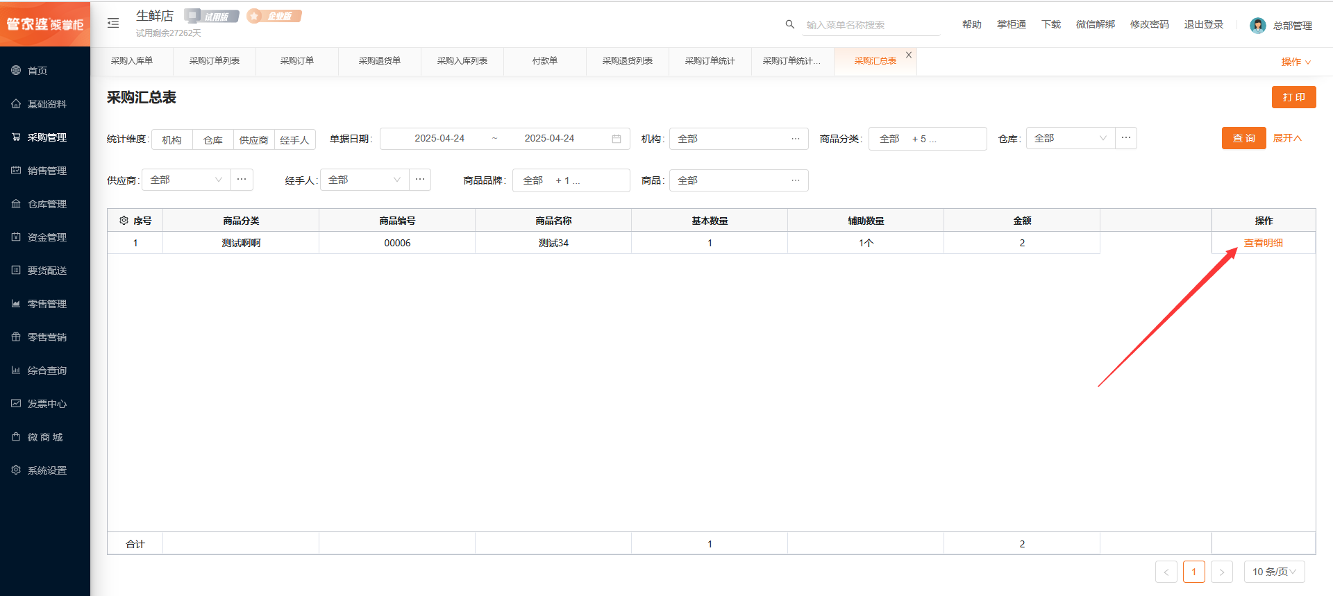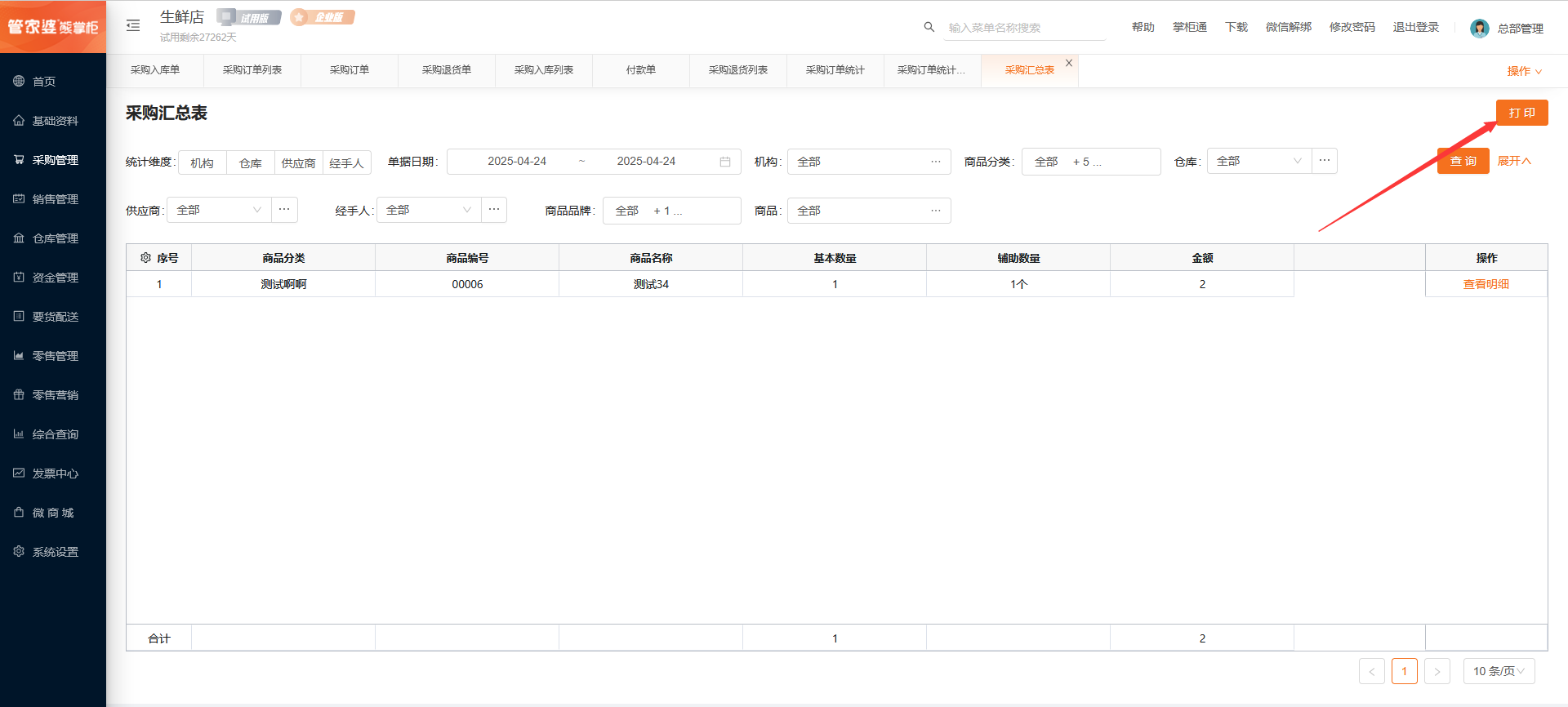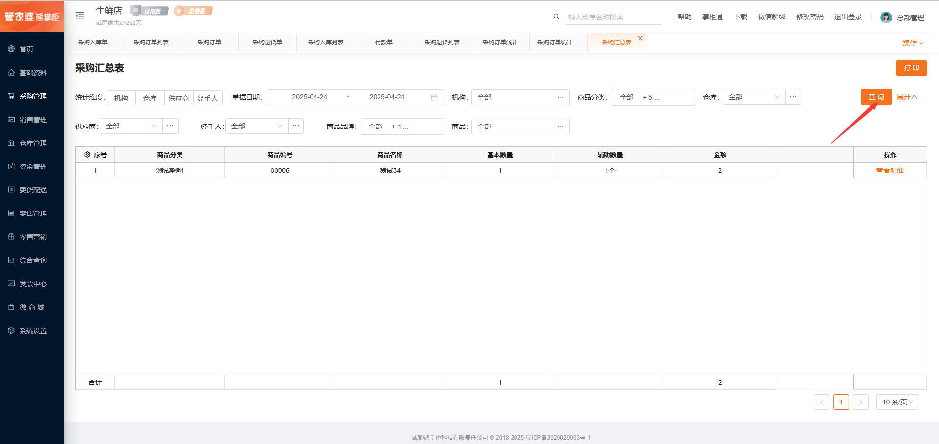 采购汇总表可以通过统计维度机构、仓库、供应商、经手人查询信息,可通过商品分类,商品品牌筛选查询 选择