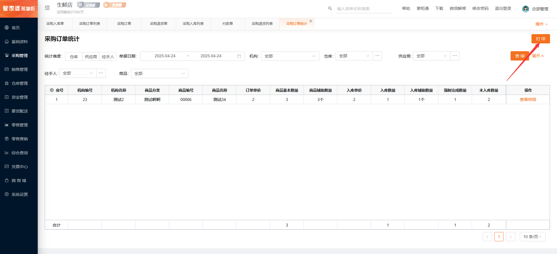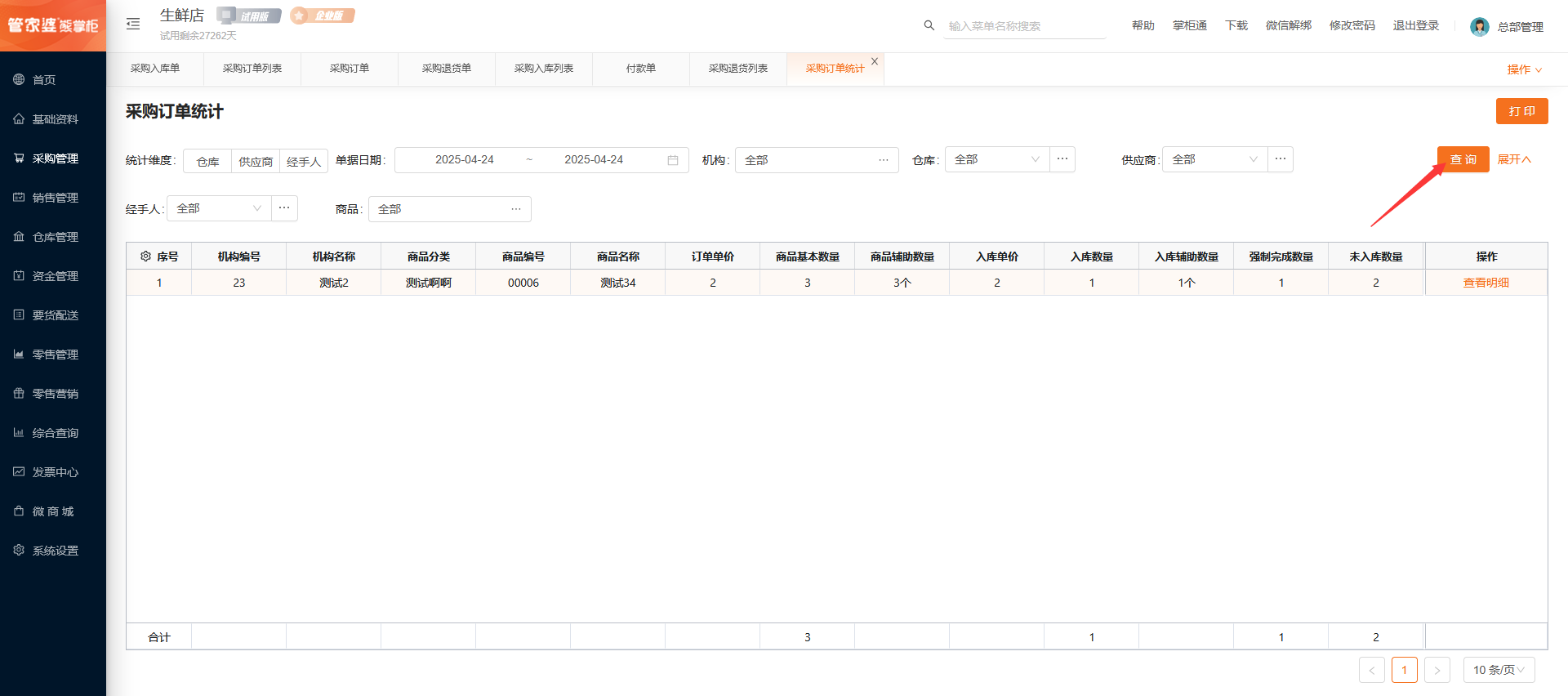采购订单统计通过维度、仓库、供应商、经手人查询,通过机构、商品筛选查询