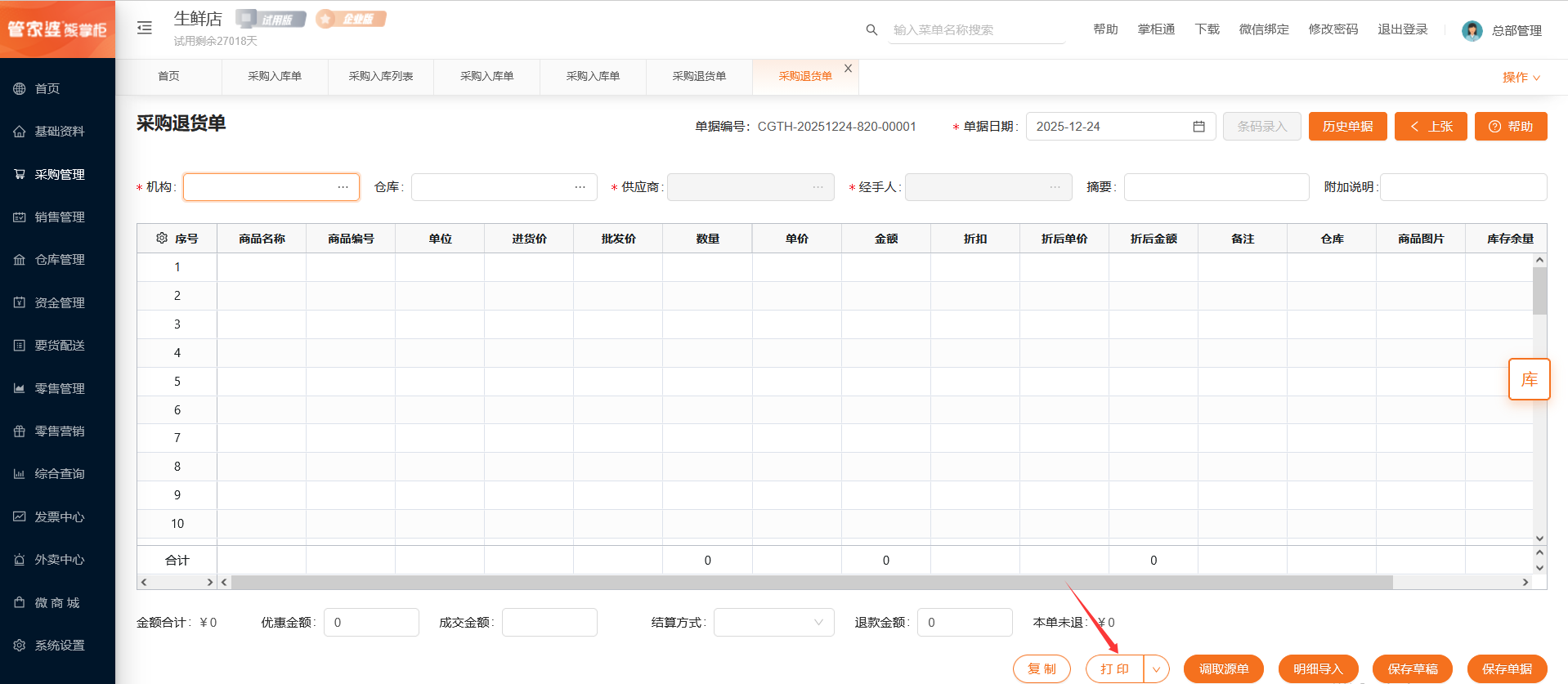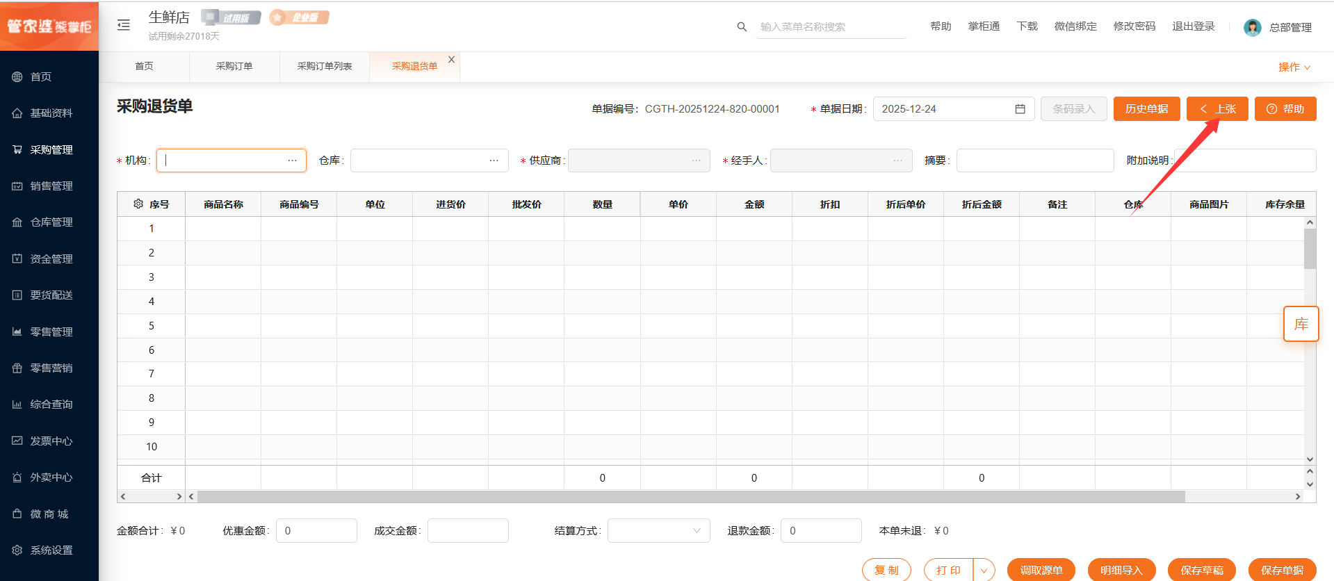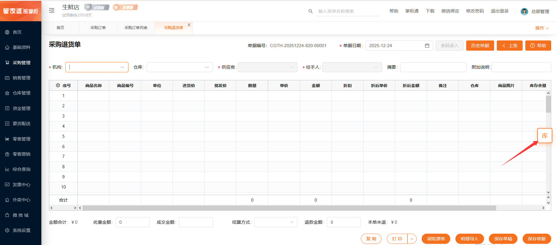 若在总部视角创建单据,则需要选择对应的采购机构、仓库和供应商;若在门店视角创建单据,则机构默认为当前门店不可选择,需要选择对应的仓库和供应商。