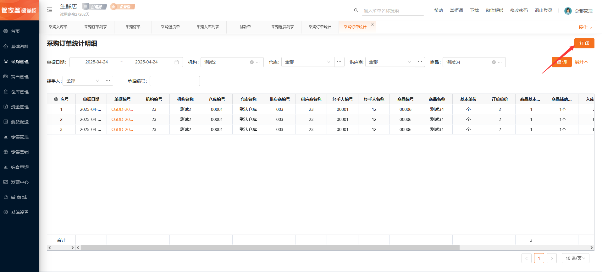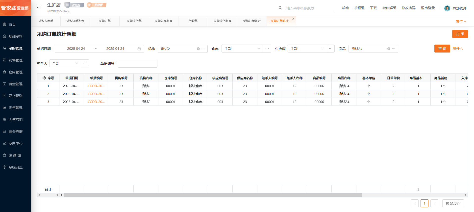 采购订单统计明细可以通过机构、仓库、供应商、商品、经手人、单据进行筛选查询