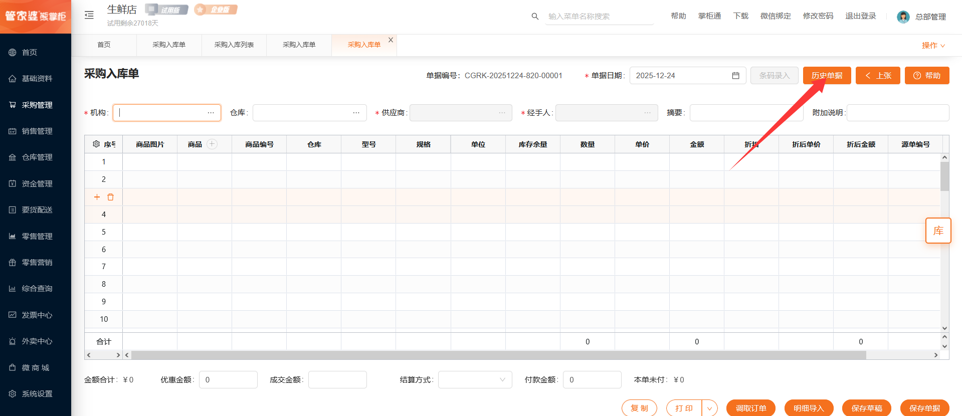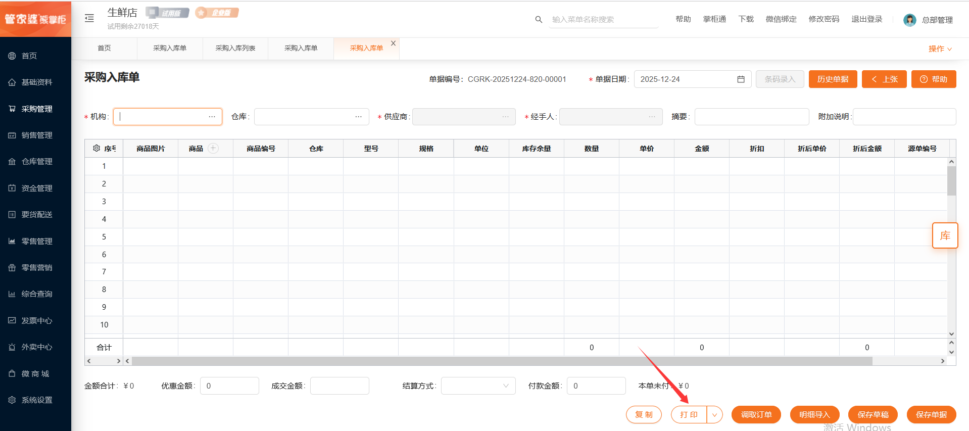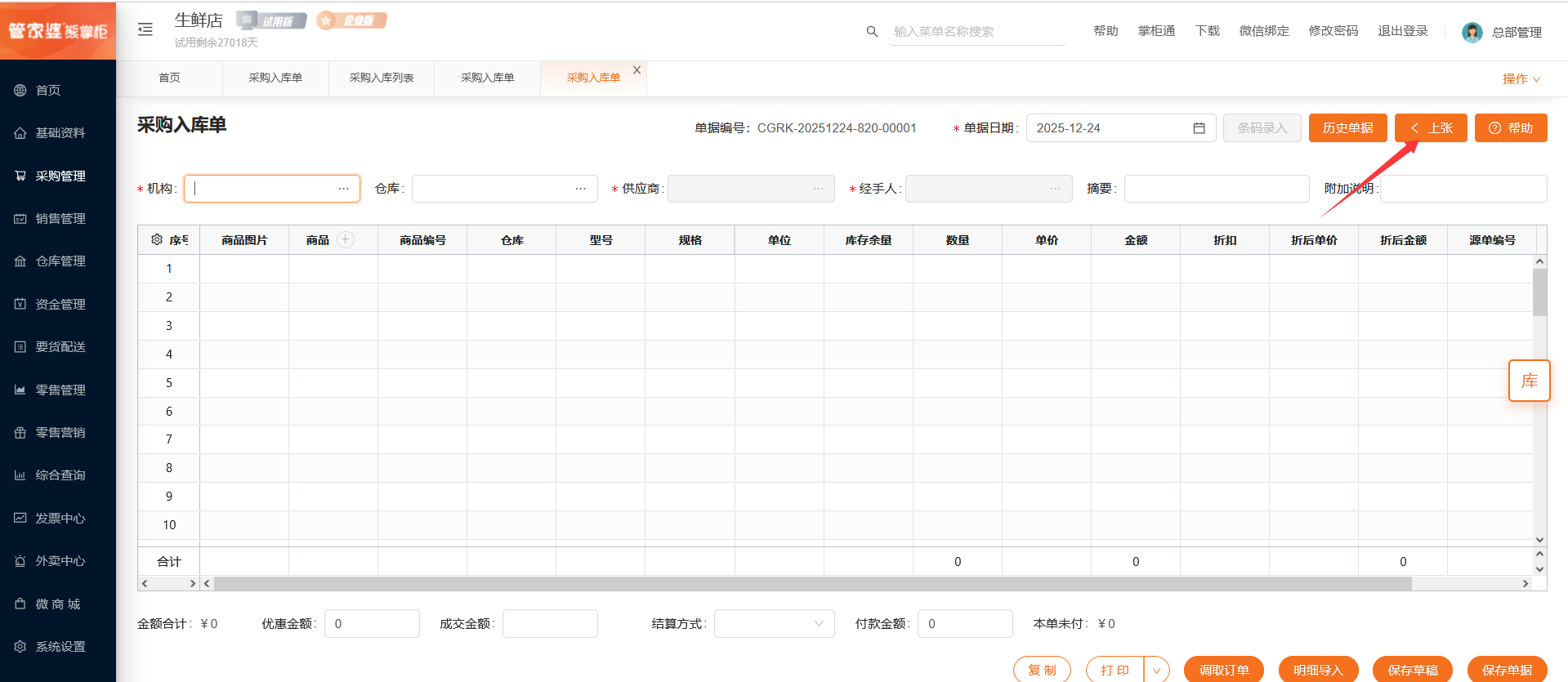 若在总部视角创建单据,则需要选择对应的采购机构、仓库和供应商;若在门店视角创建单据,则机构默认为当前门店不可选择,需要选择对应的仓库和供应商。