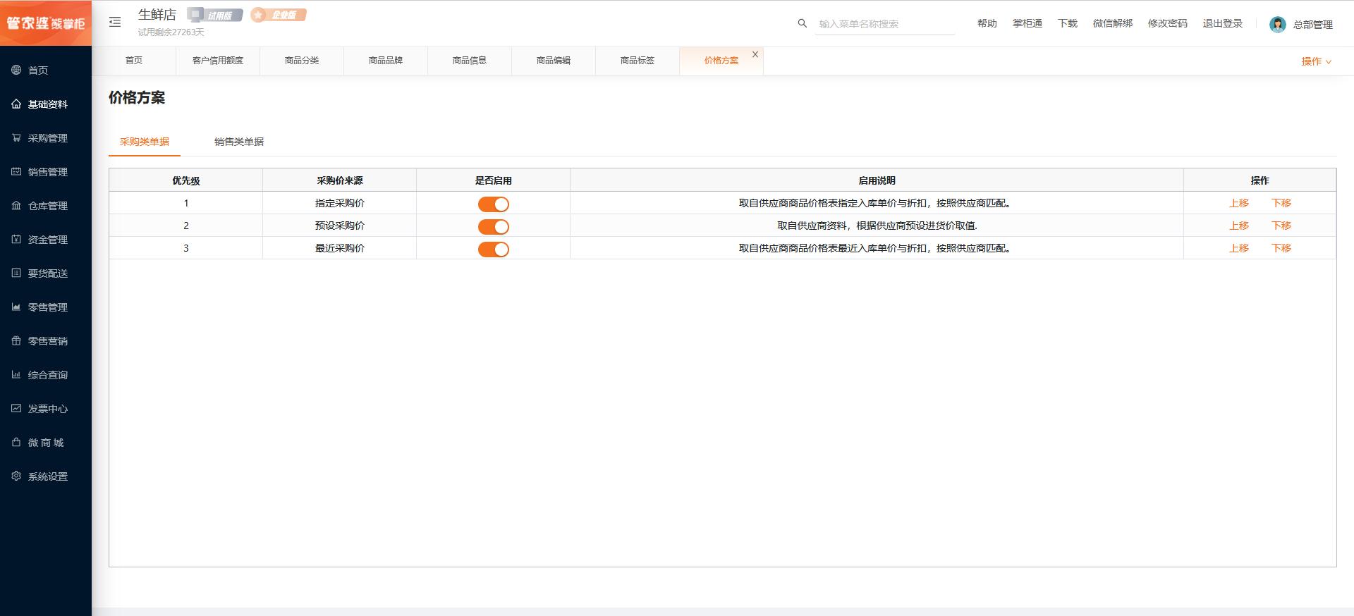调整价格跟踪的顺序,只要是启用的价格,做采销单据时,就会按照这里显示的顺序来获取价格。
