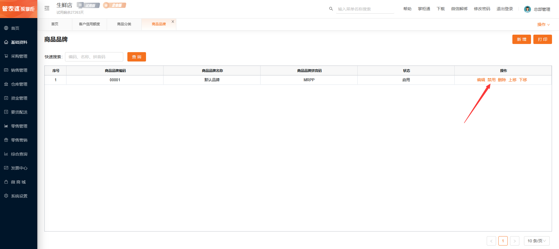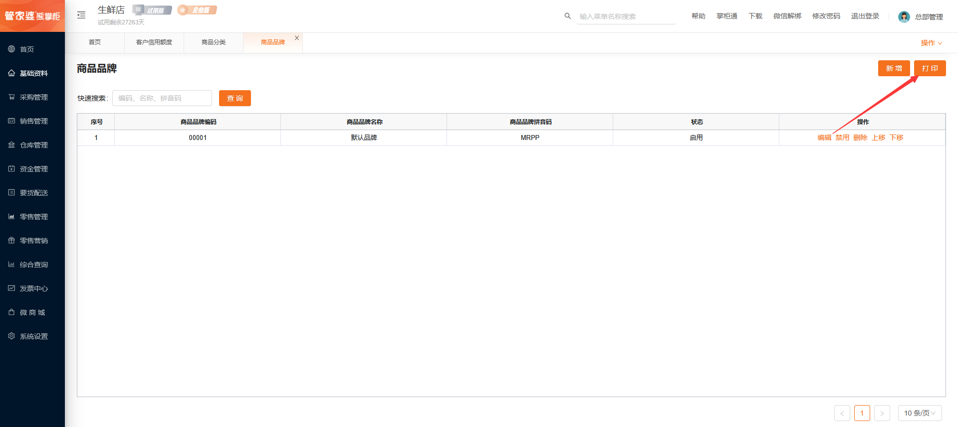 通过打印管理器,打印或导出商品品牌。