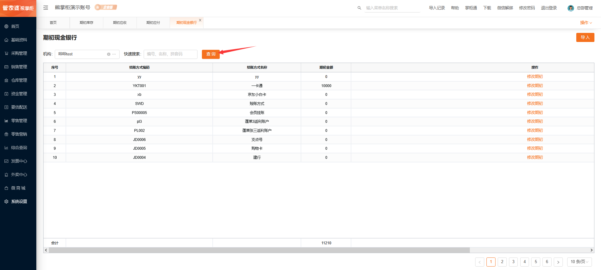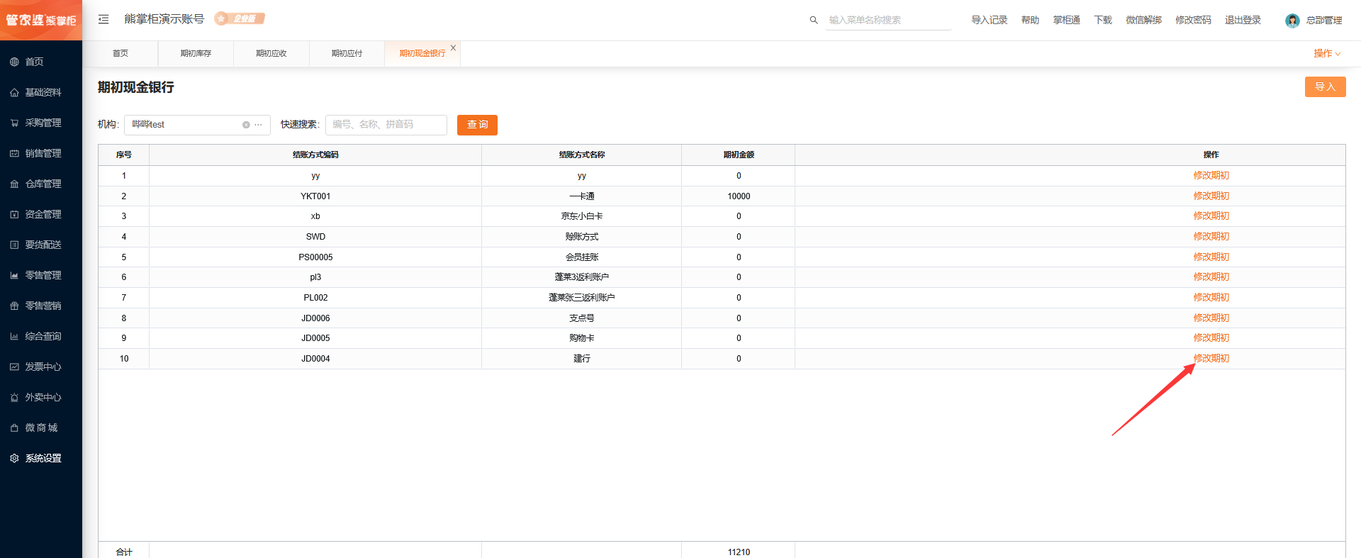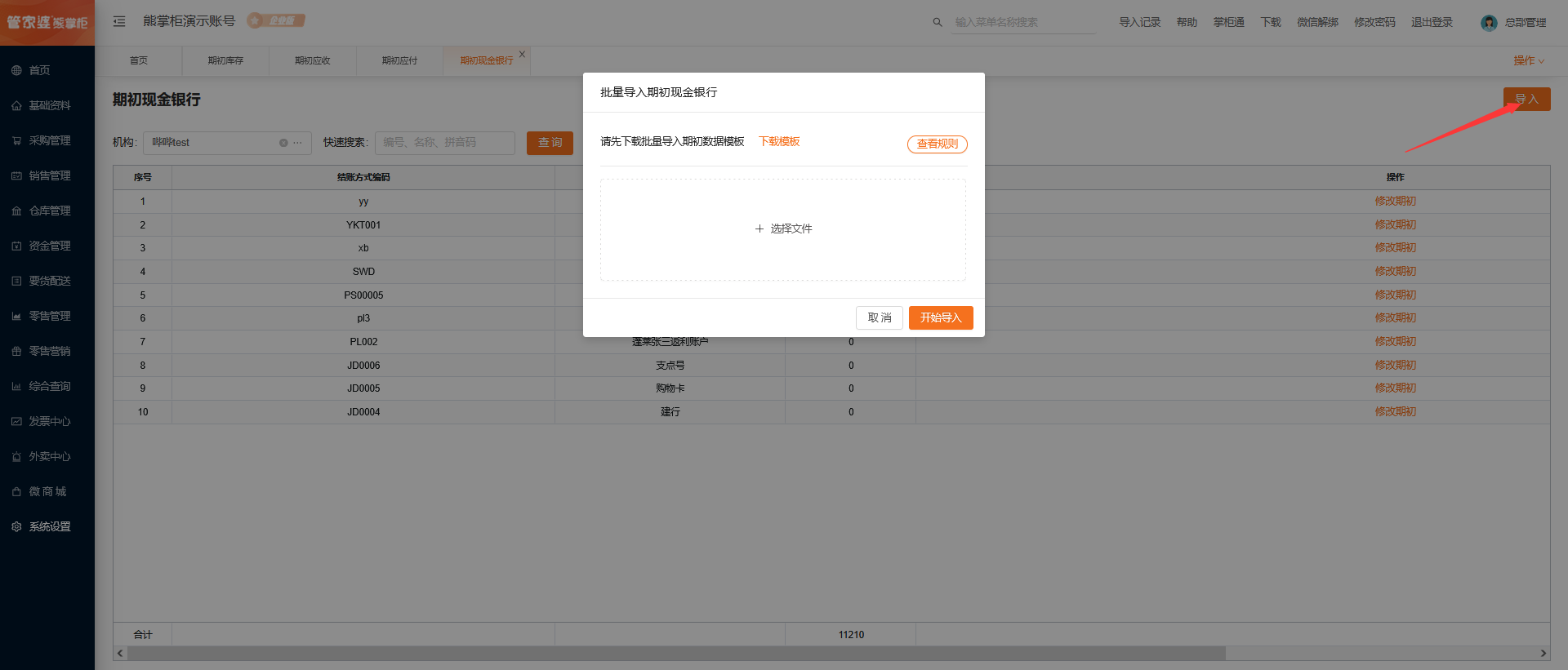 按机构来导入期初现金银行,点击导入,下载模版后,上传模版即可。(支持覆盖导入)