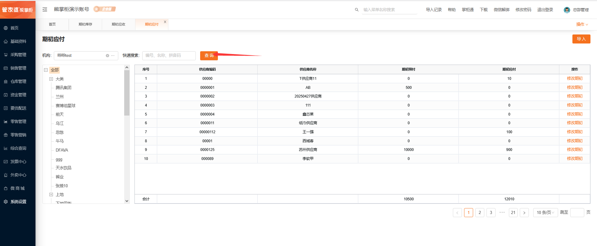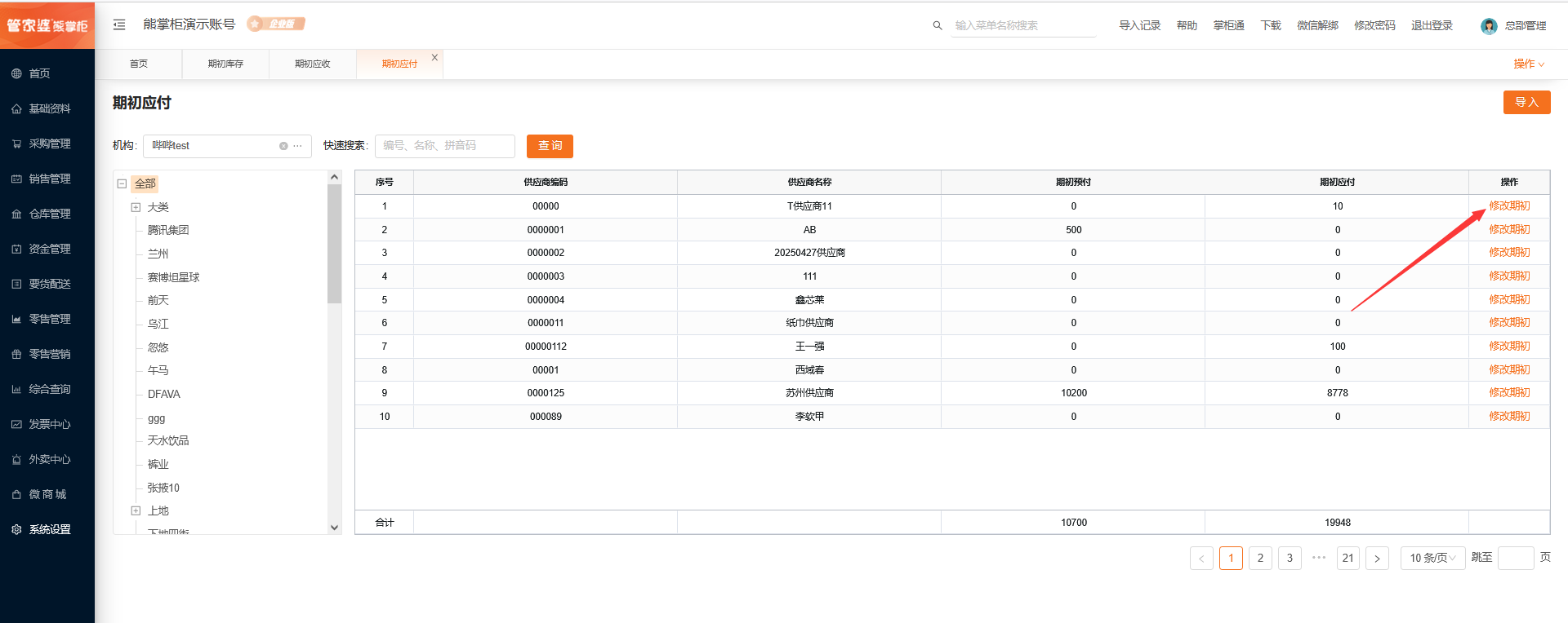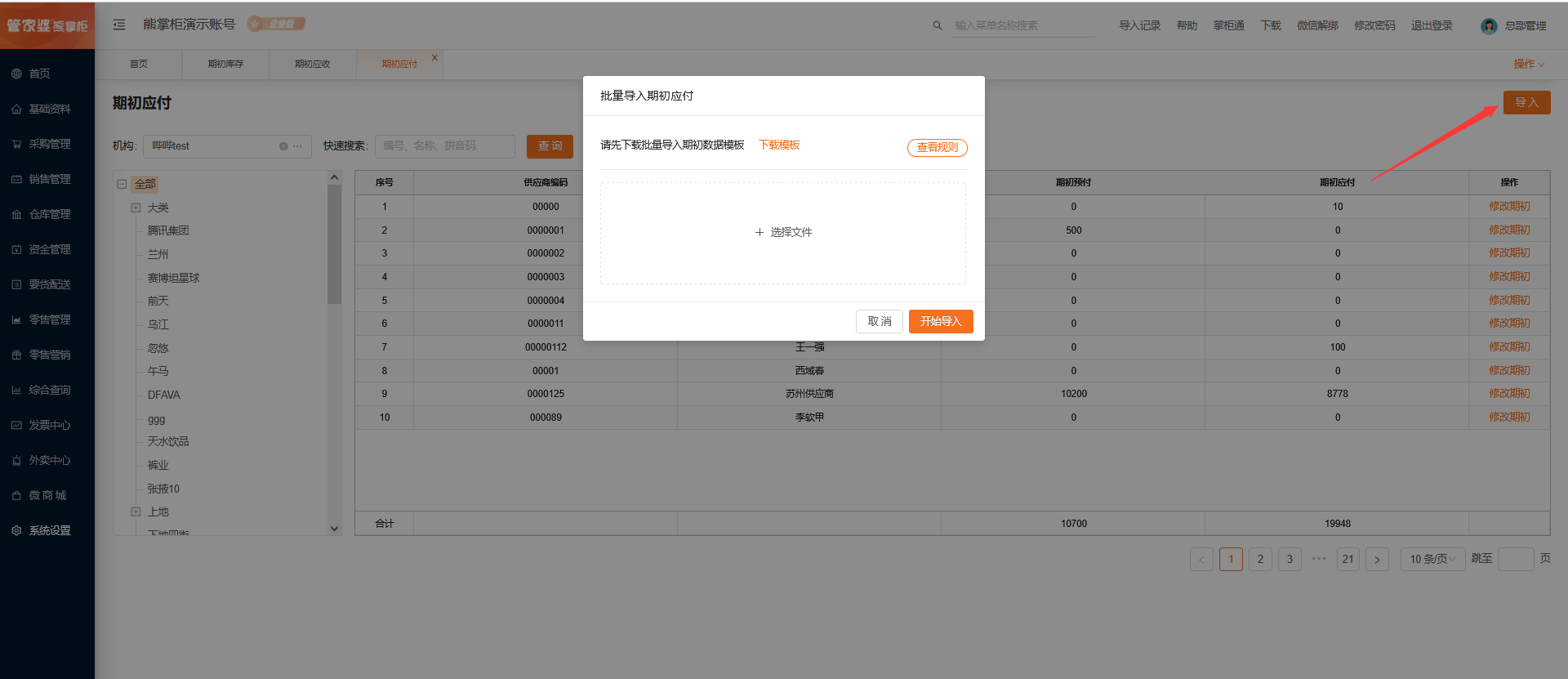 按机构来导入期初应付,点击导入,下载模版后,上传模版即可。(支持覆盖导入)