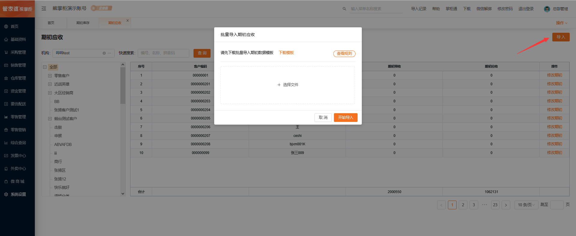 按机构来导入期初应收,点击导入,下载模版后,上传模版即可。(支持覆盖导入)