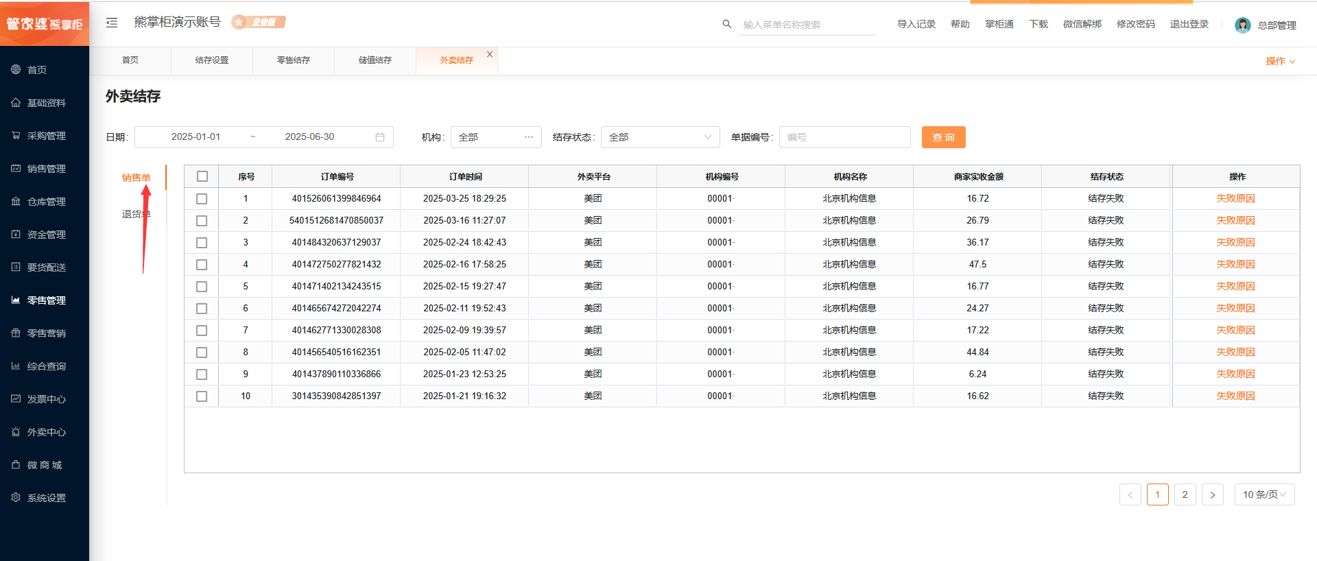 查看外卖销售单的结存情况,若状态是结存失败的,可点击失败原因查看具体原因。