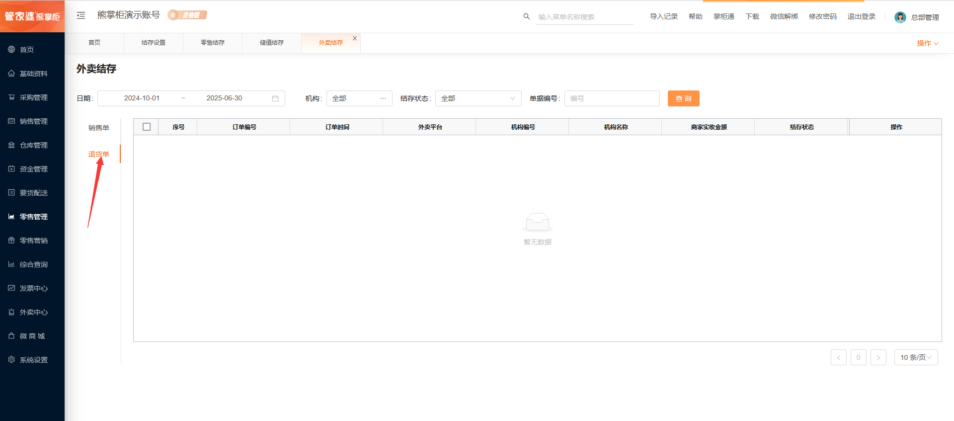 查看外卖退货单的结存情况,若状态是结存失败的,可点击失败原因查看具体原因。