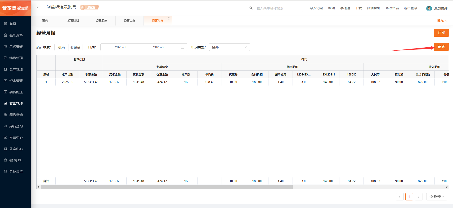 * 零售下的实收金额=零售下的流水金额-零售下的优惠金额;零售下的实收金额=零售下的收入明细之和