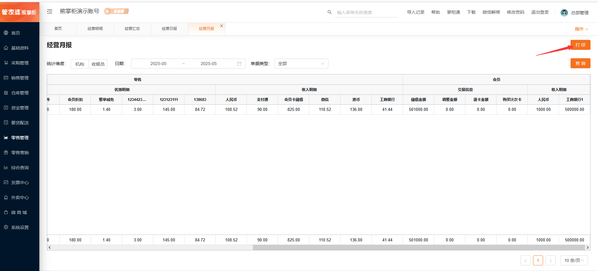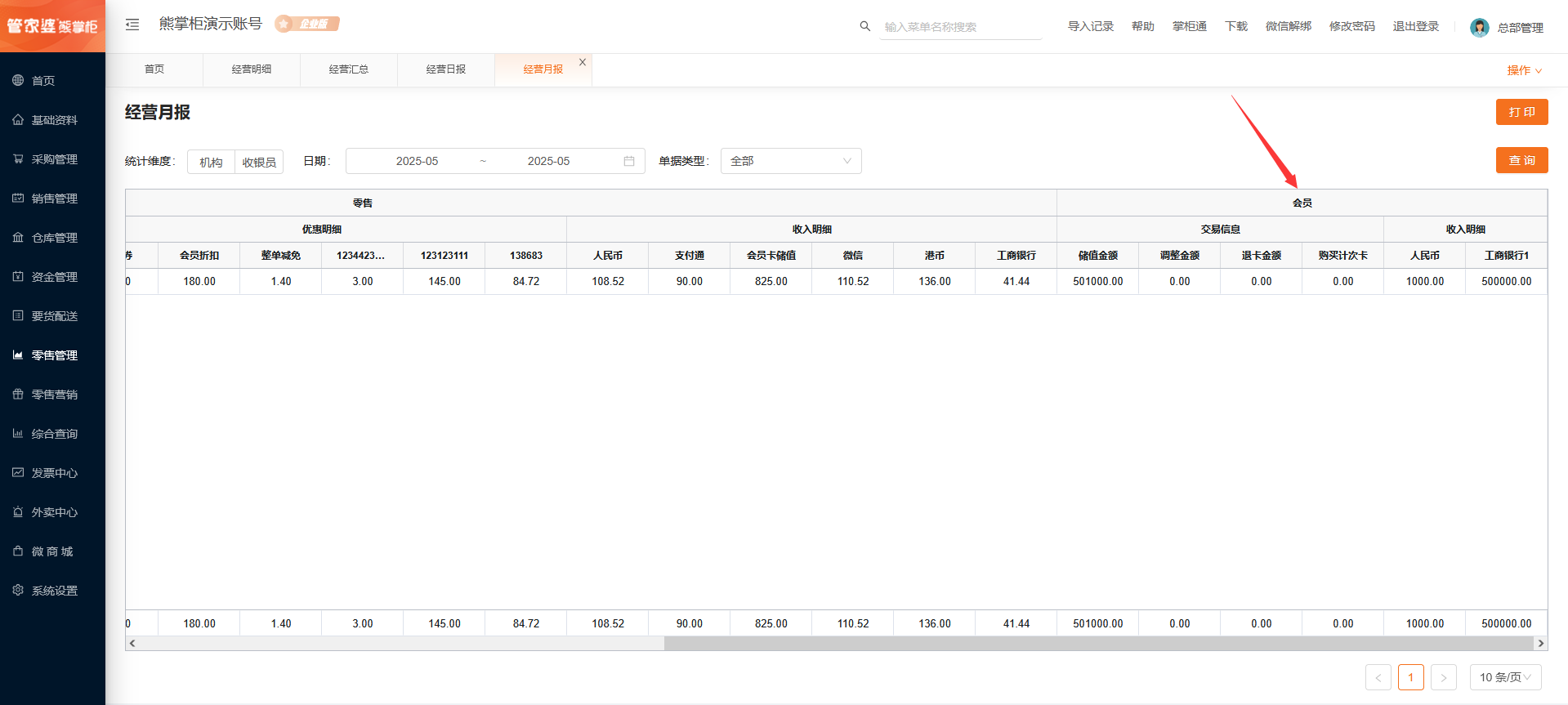 *收款总额=零售下的实收金额+会员下的收入明细之和