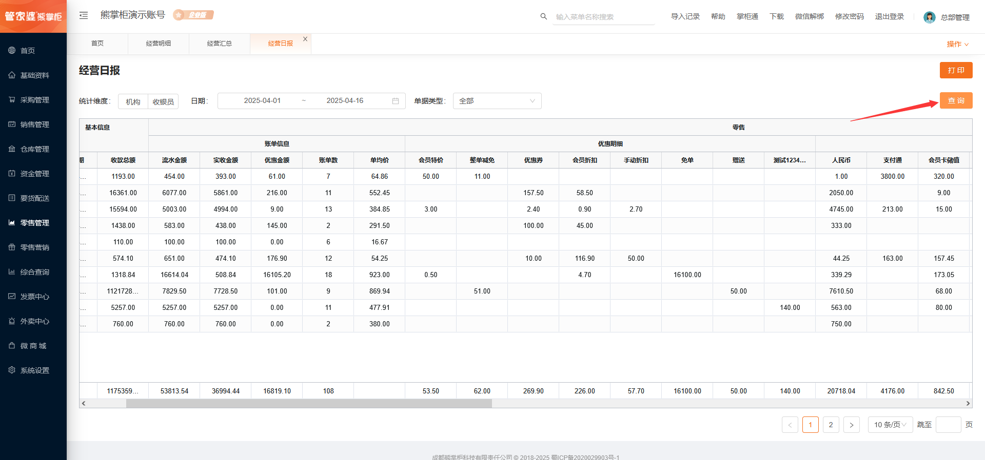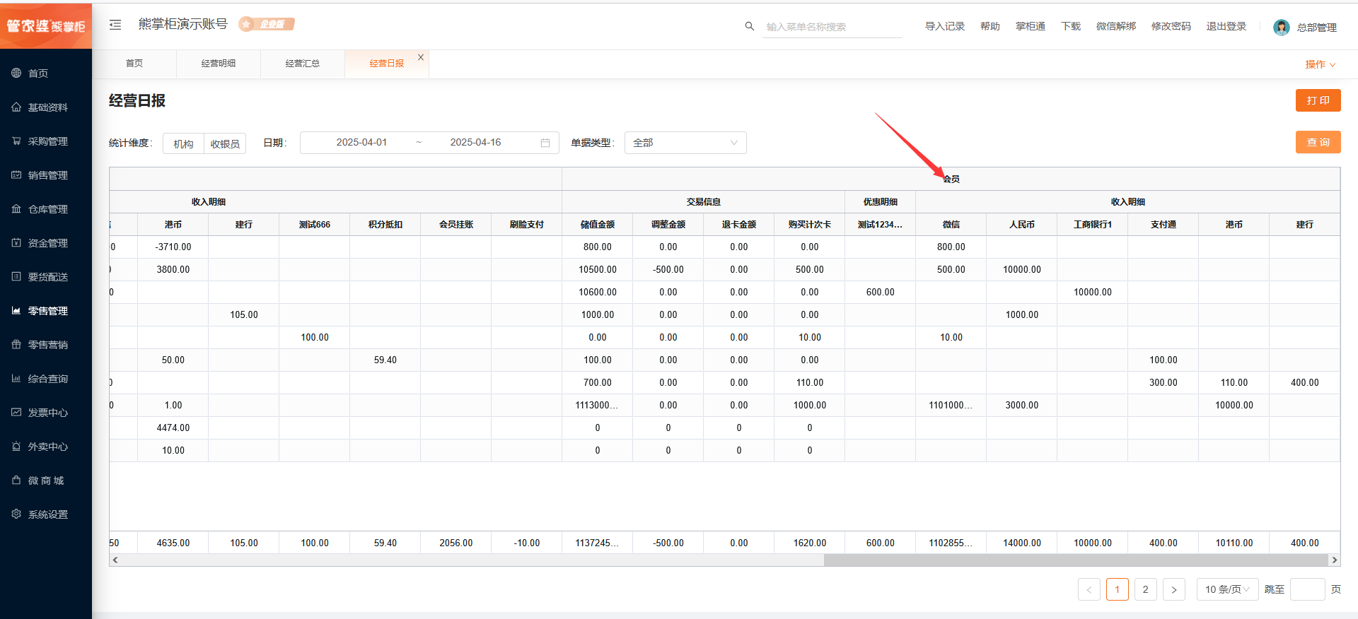*收款总额=零售下的实收金额+会员下的收入明细之和