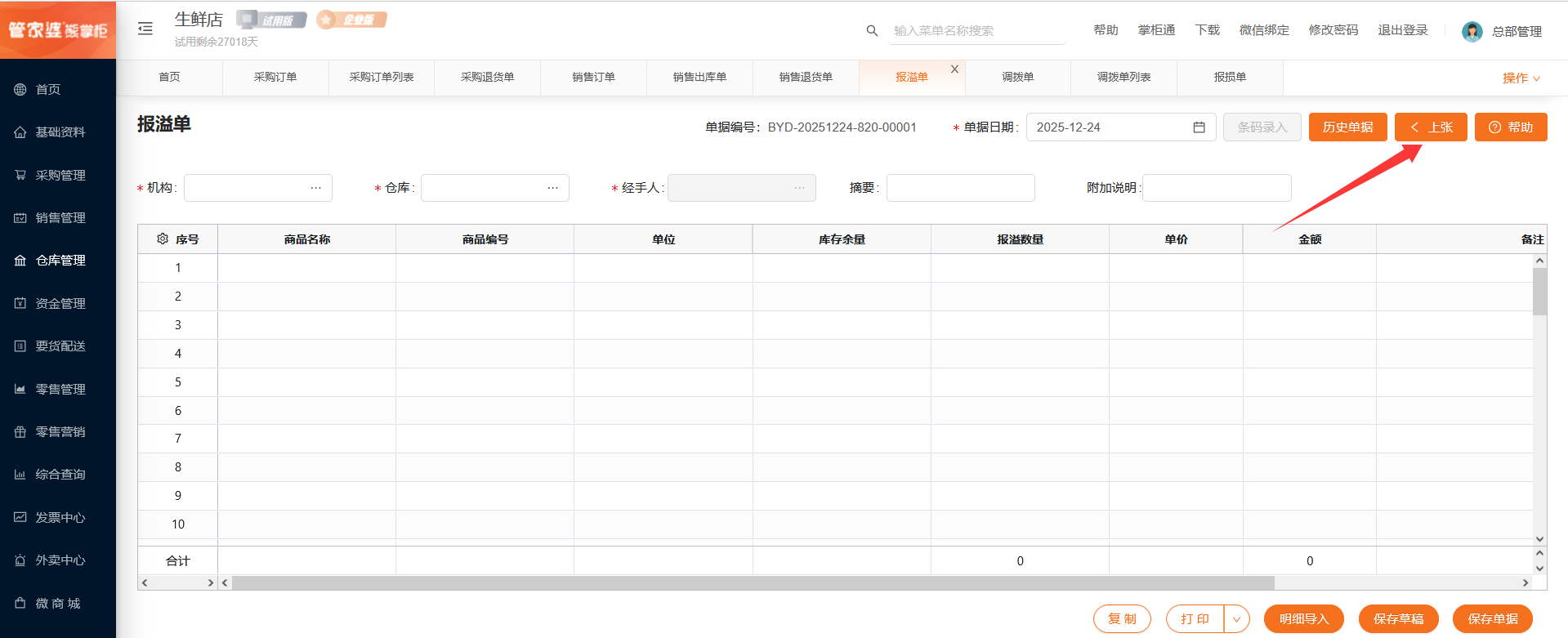 跳转到报溢单列表界面,默认查询时间是当前的单据日期。