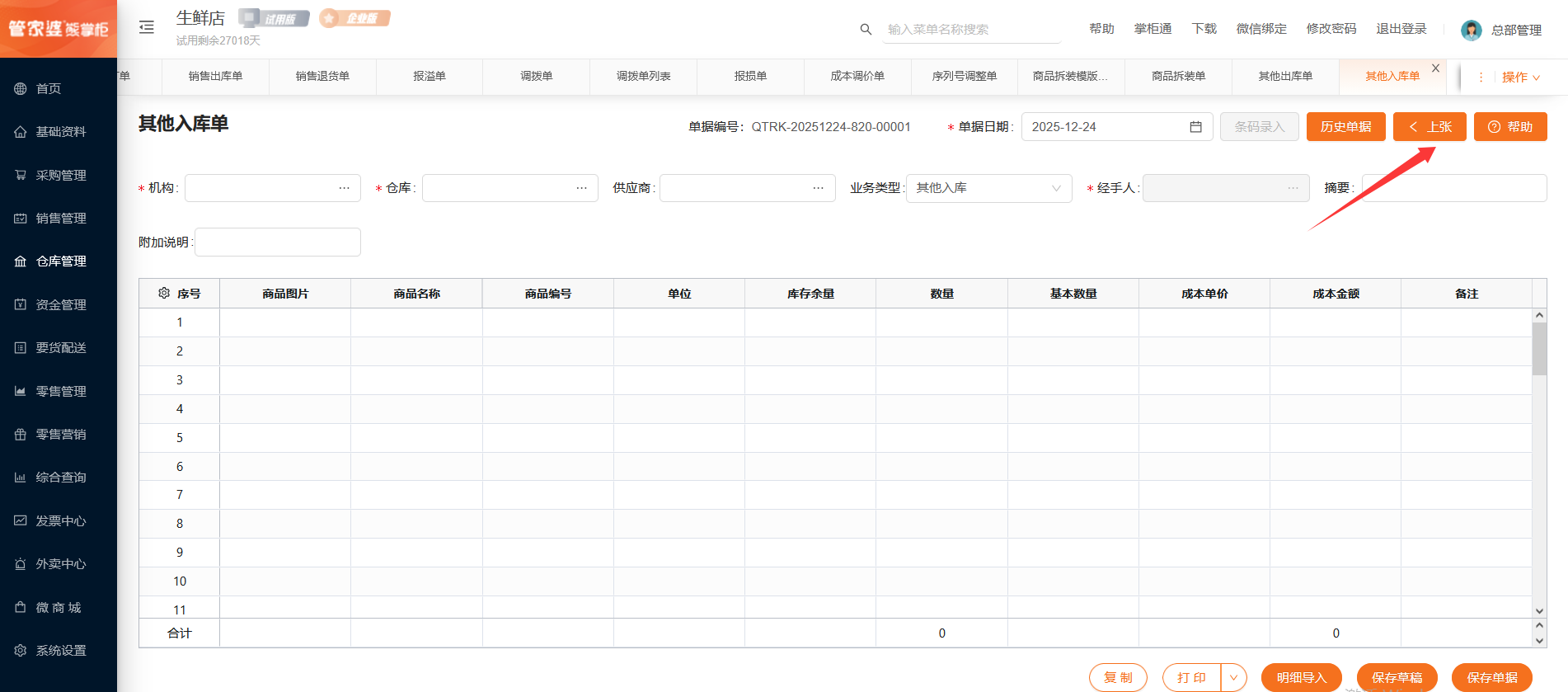跳转到其他入库单列表界面,默认查询时间是当前的单据日期。