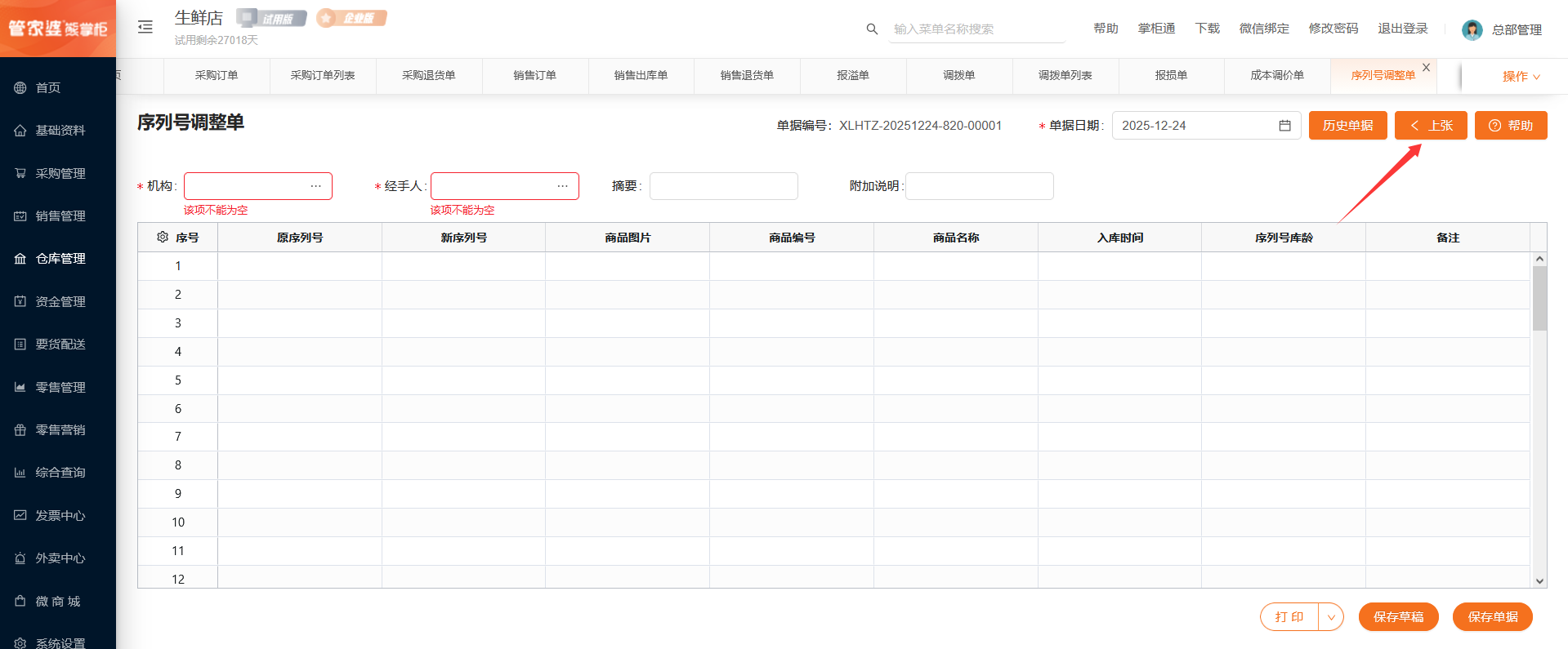 跳转到序列号调整单列表界面,默认查询时间是当前的单据日期。